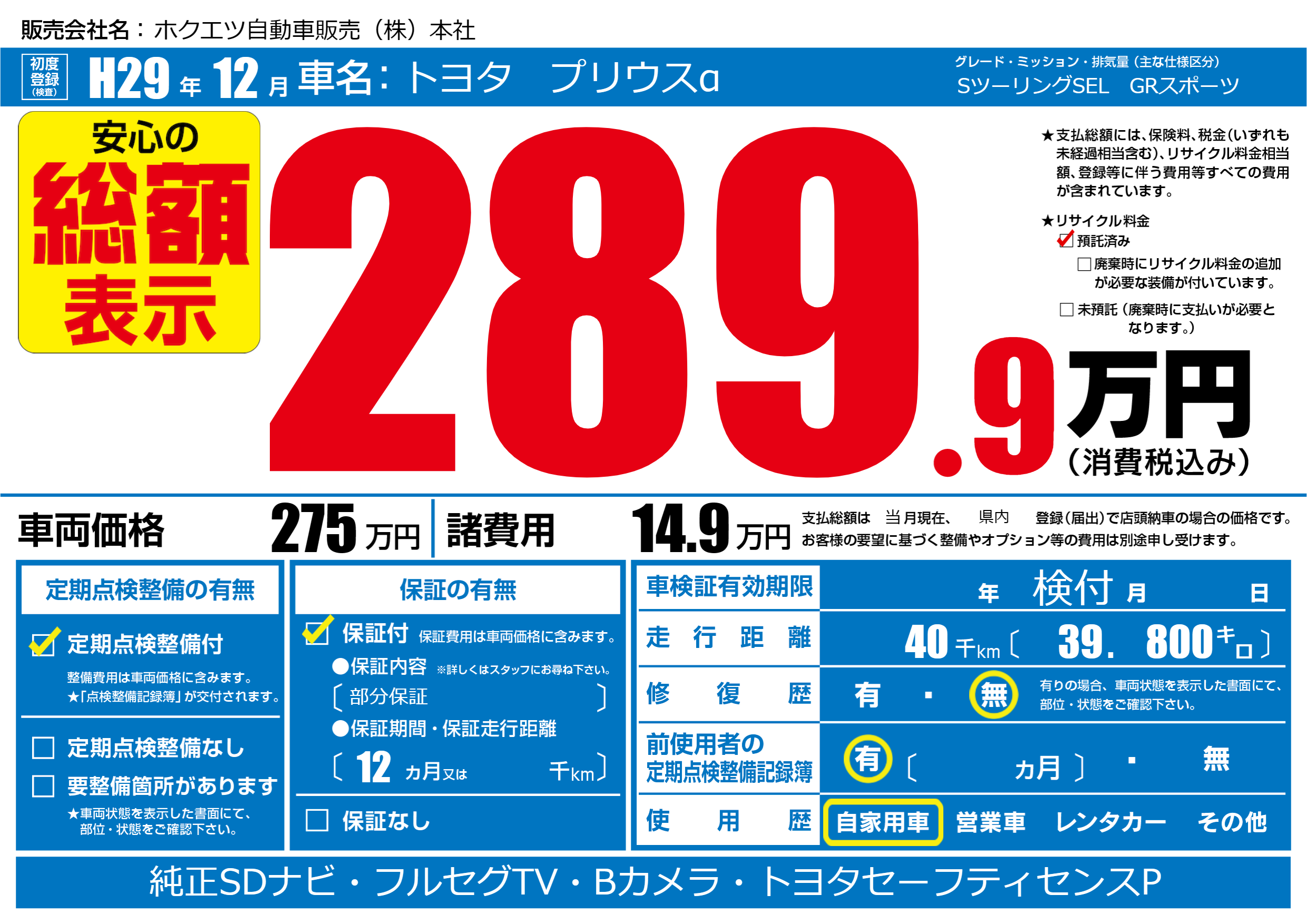 | 車名 | トヨタ プリウスα | グレード ミッション 排気量 |