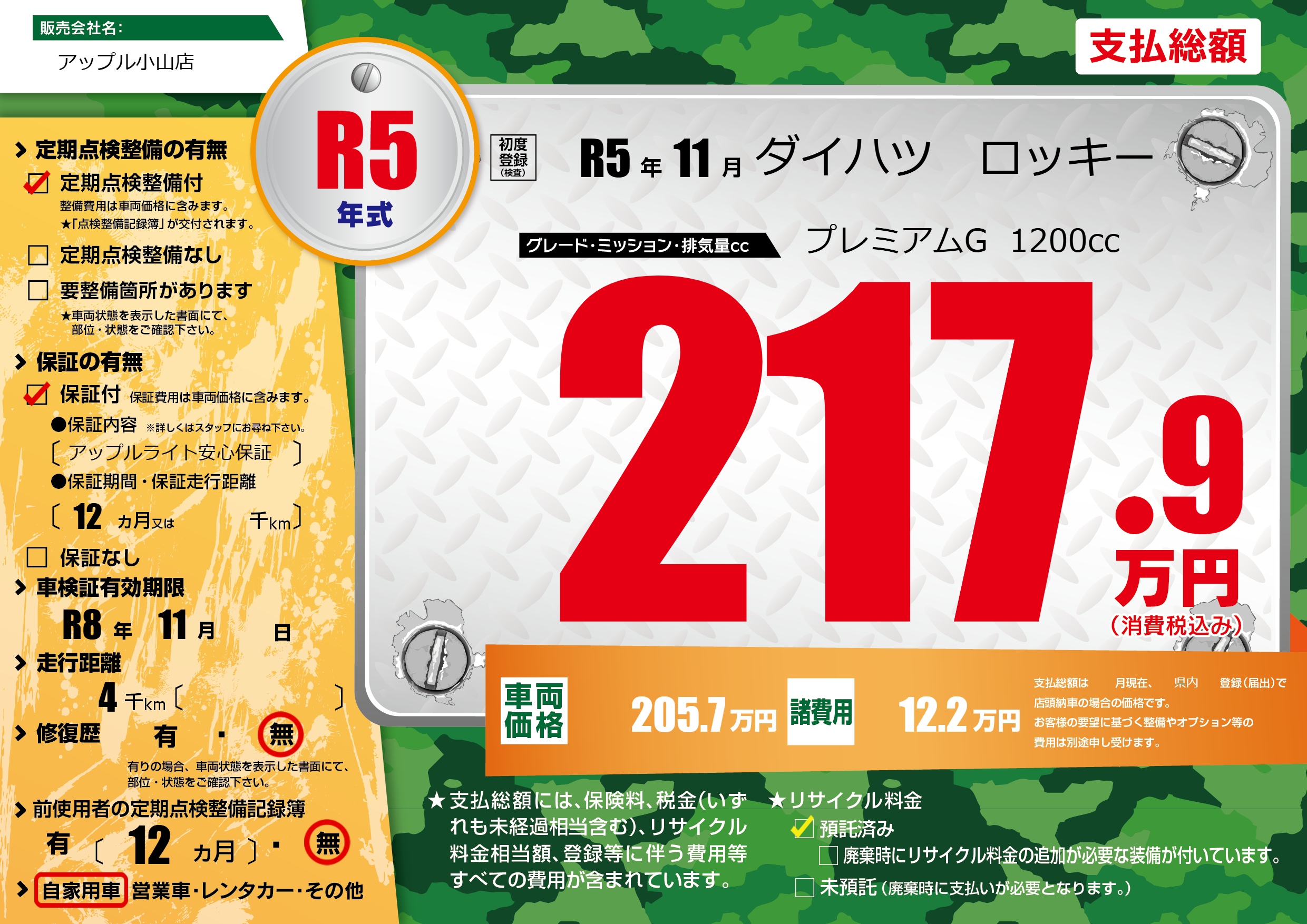 | 車名 | ダイハツ ロッキー | グレード ミッション 排気量 |