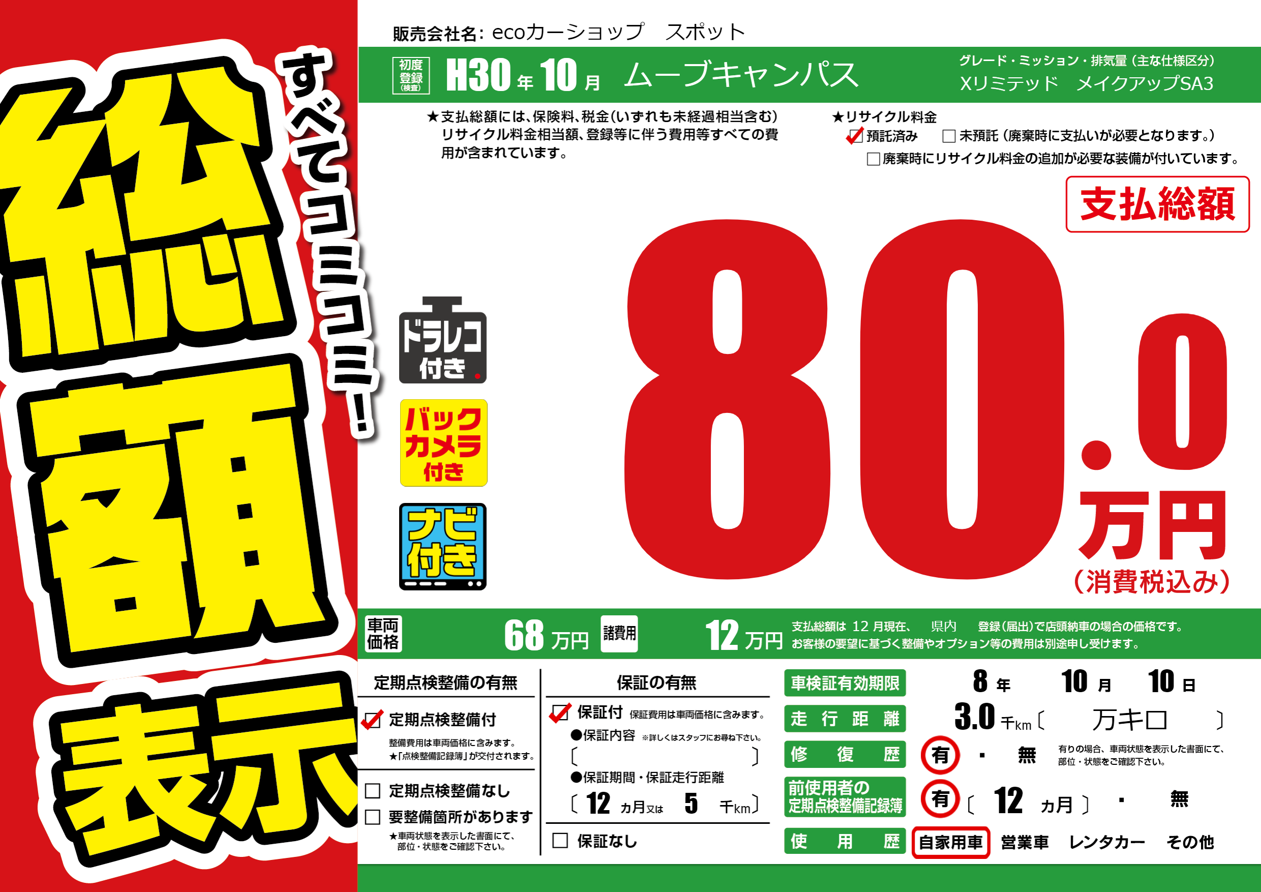 | 走行キロ | 0.3万km | 初年度登録 | H30年10月 |