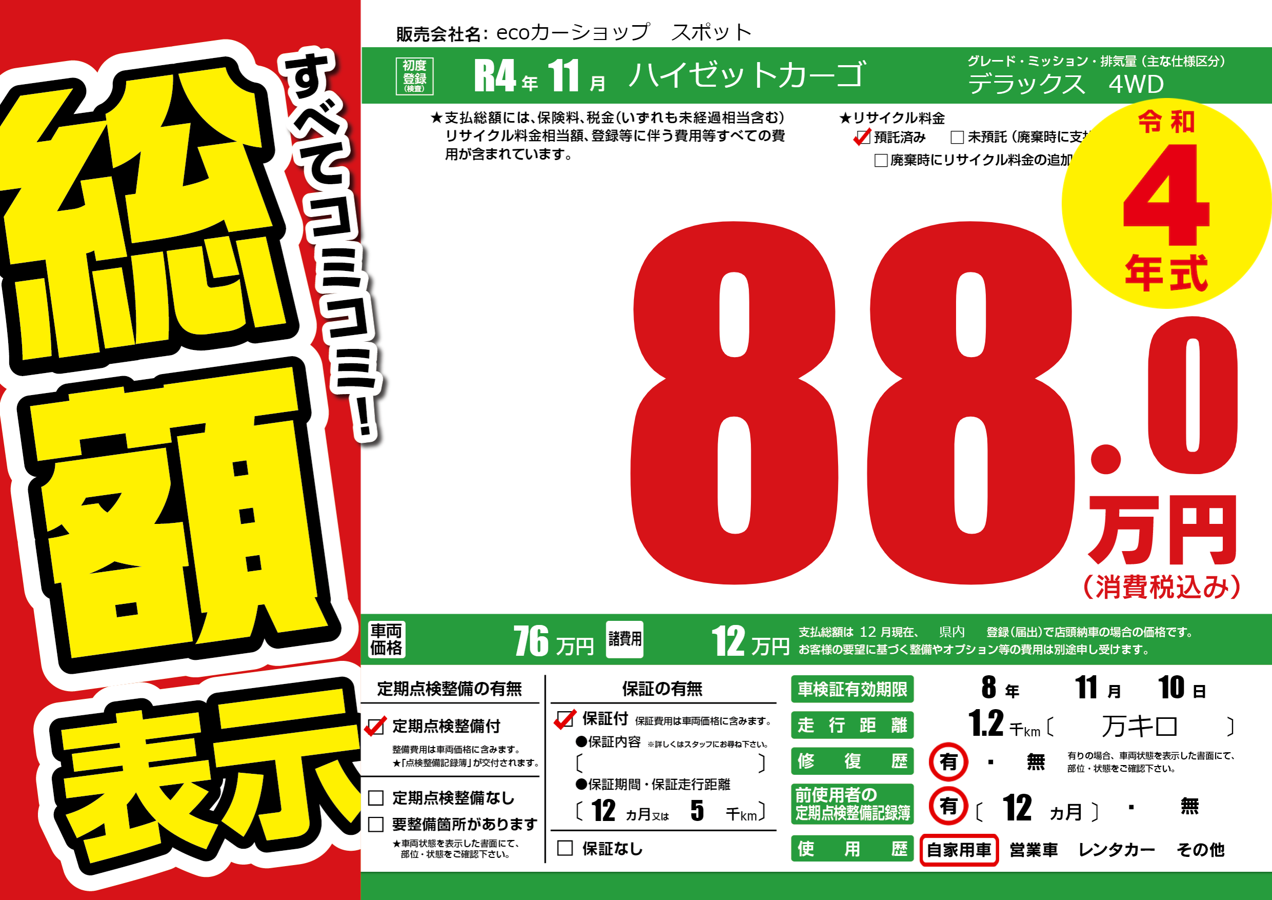 | 車名 | ハイゼットカーゴ | グレード ミッション 排気量 |