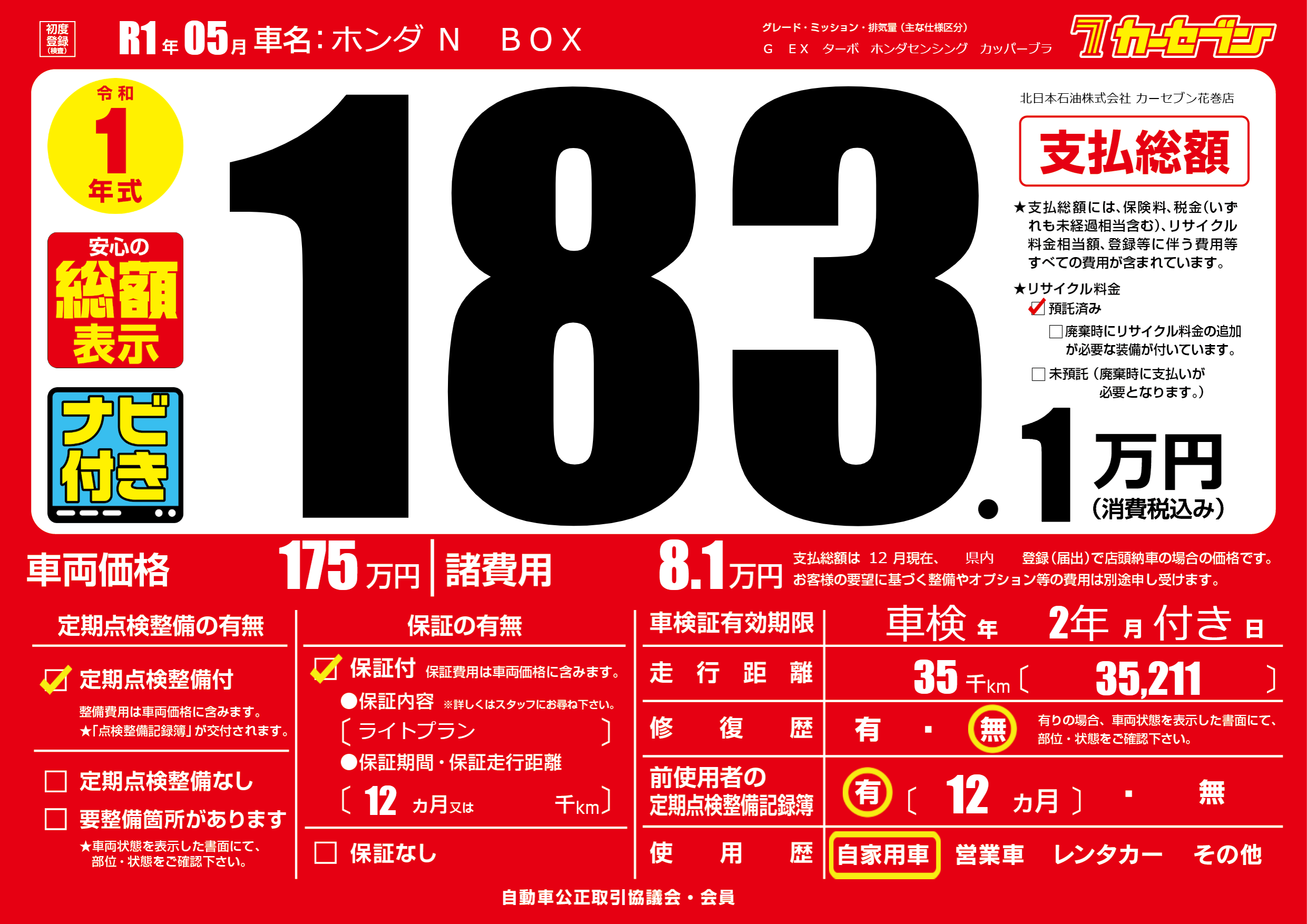 | 車名 | ホンダ N BOX | グレード ミッション 排気量 |