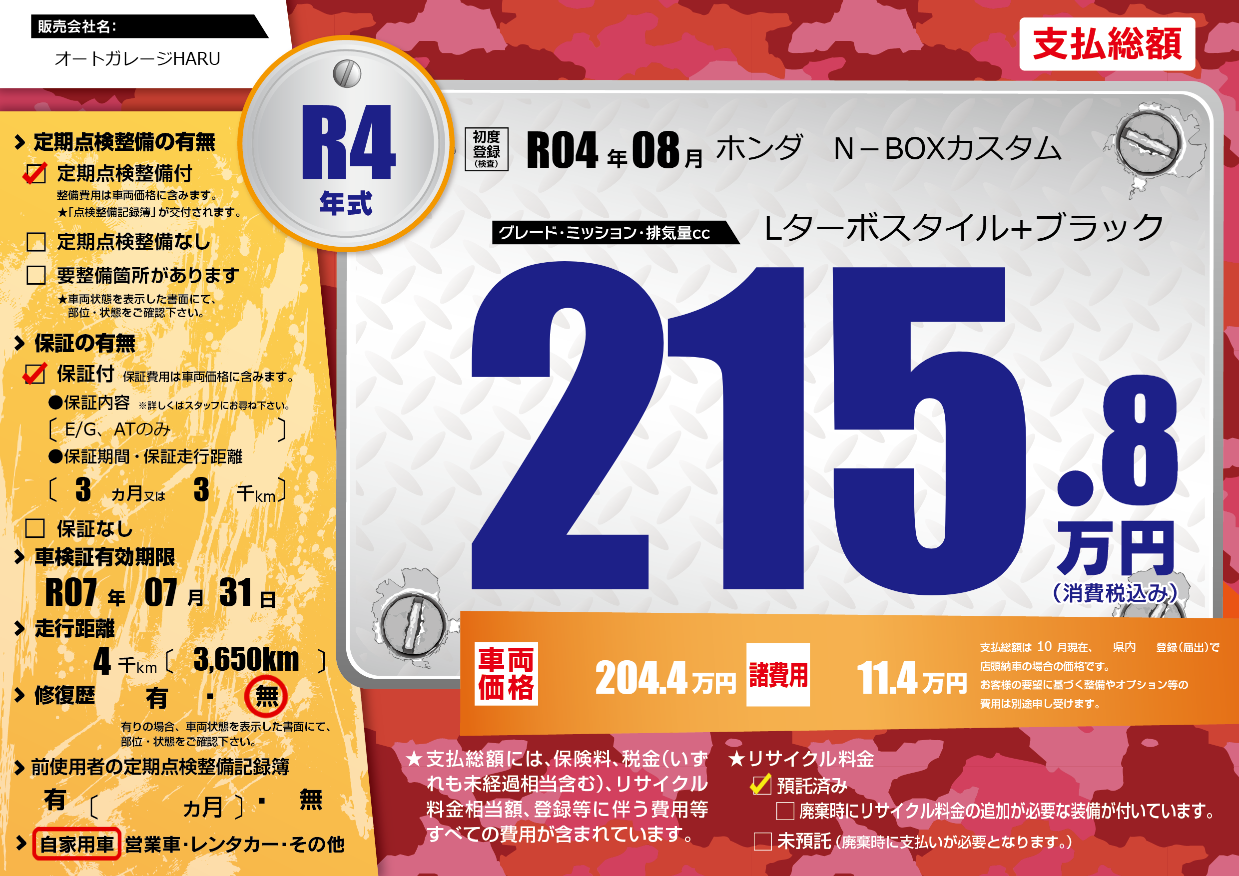 | 車名 | ホンダ N-BOXカスタム | グレード ミッション 排気量 |