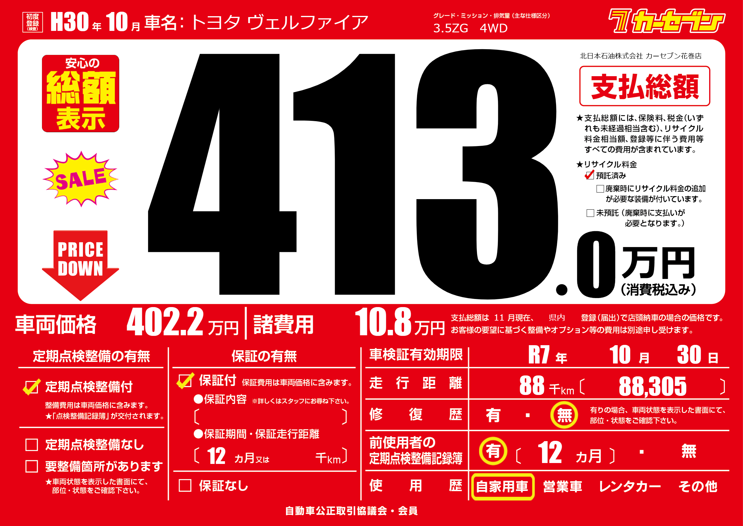| 車名 | トヨタ ヴェルファイア | グレード ミッション 排気量 |