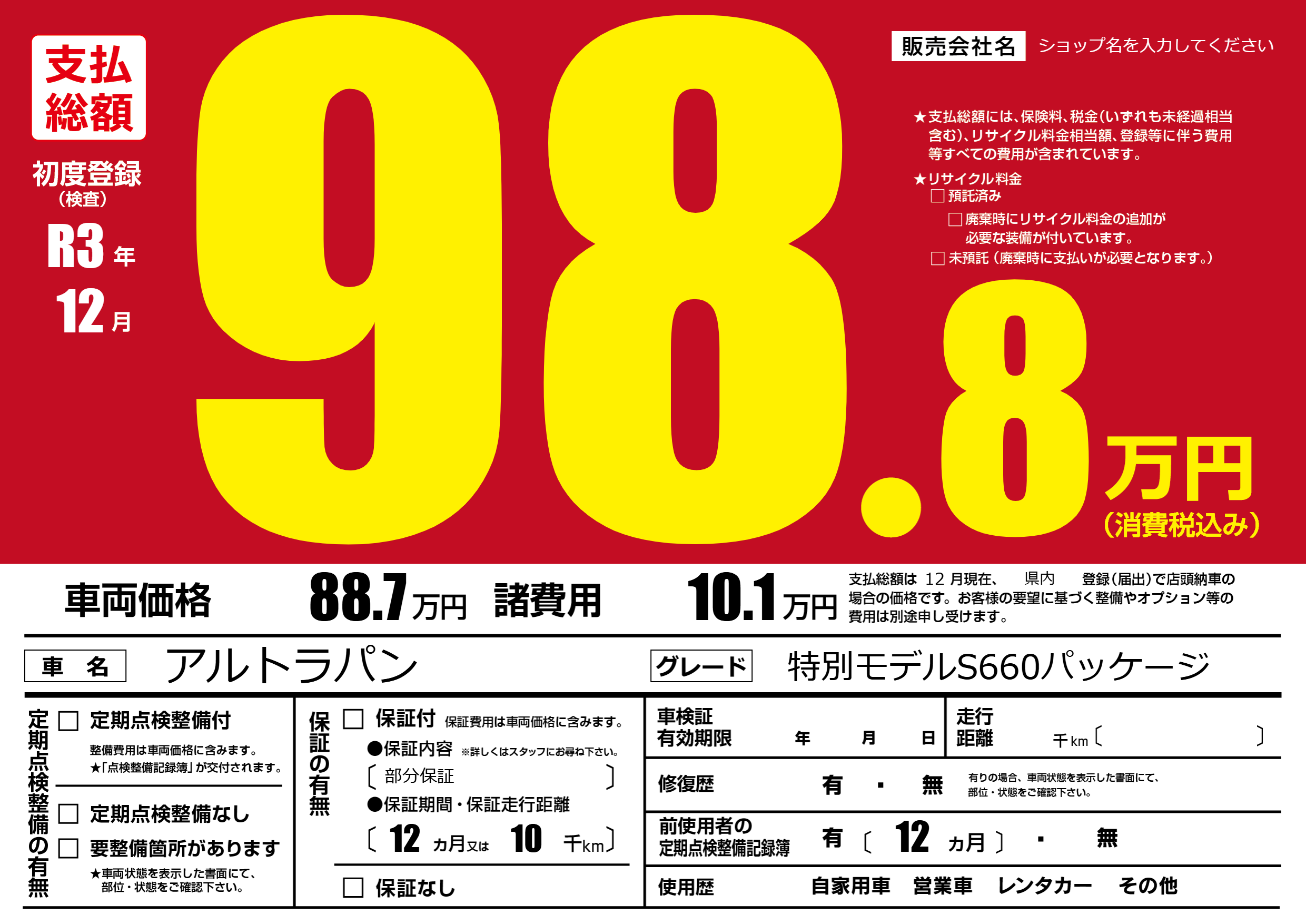 | 車検制限 | - 年 - 月 - 日 | ||