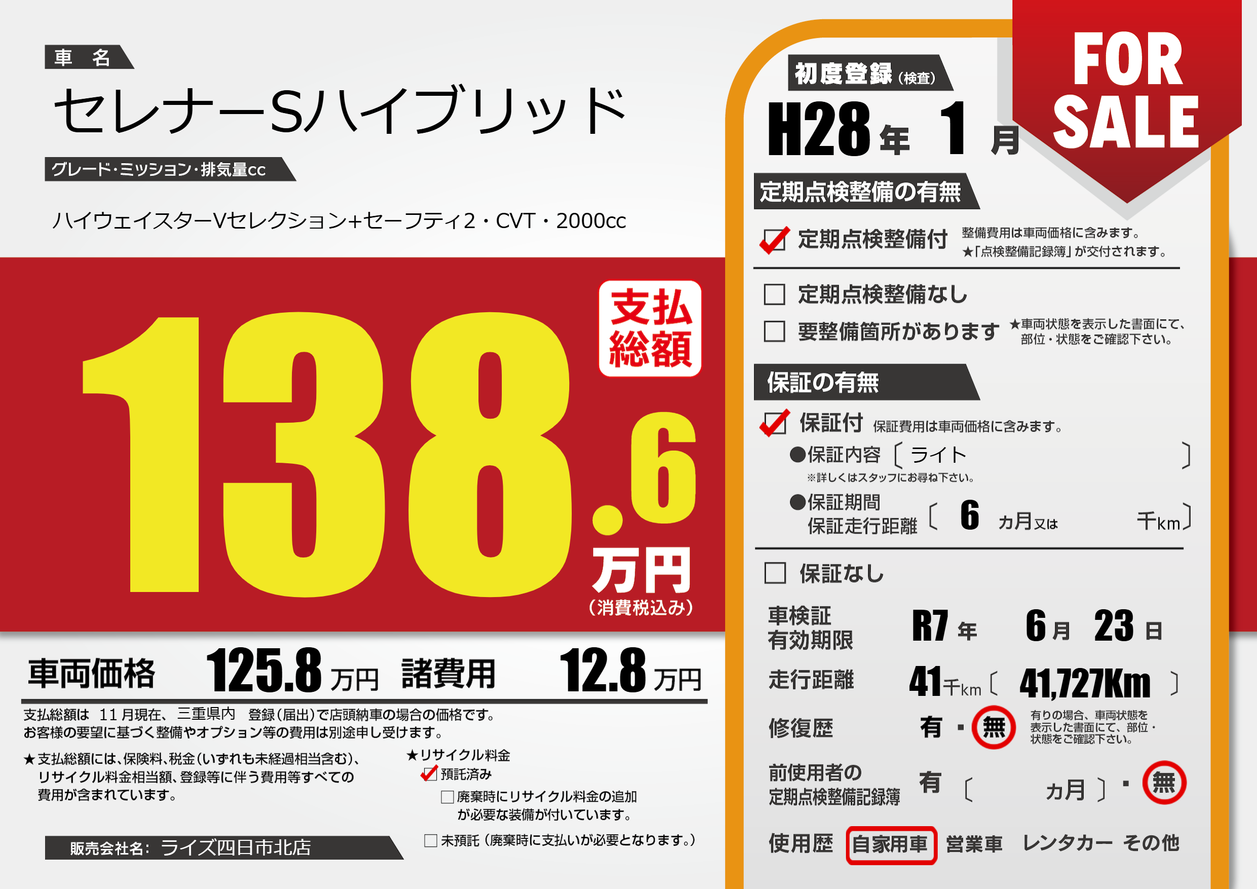 | 車名 | セレナーSハイブリッド | グレード ミッション 排気量 |