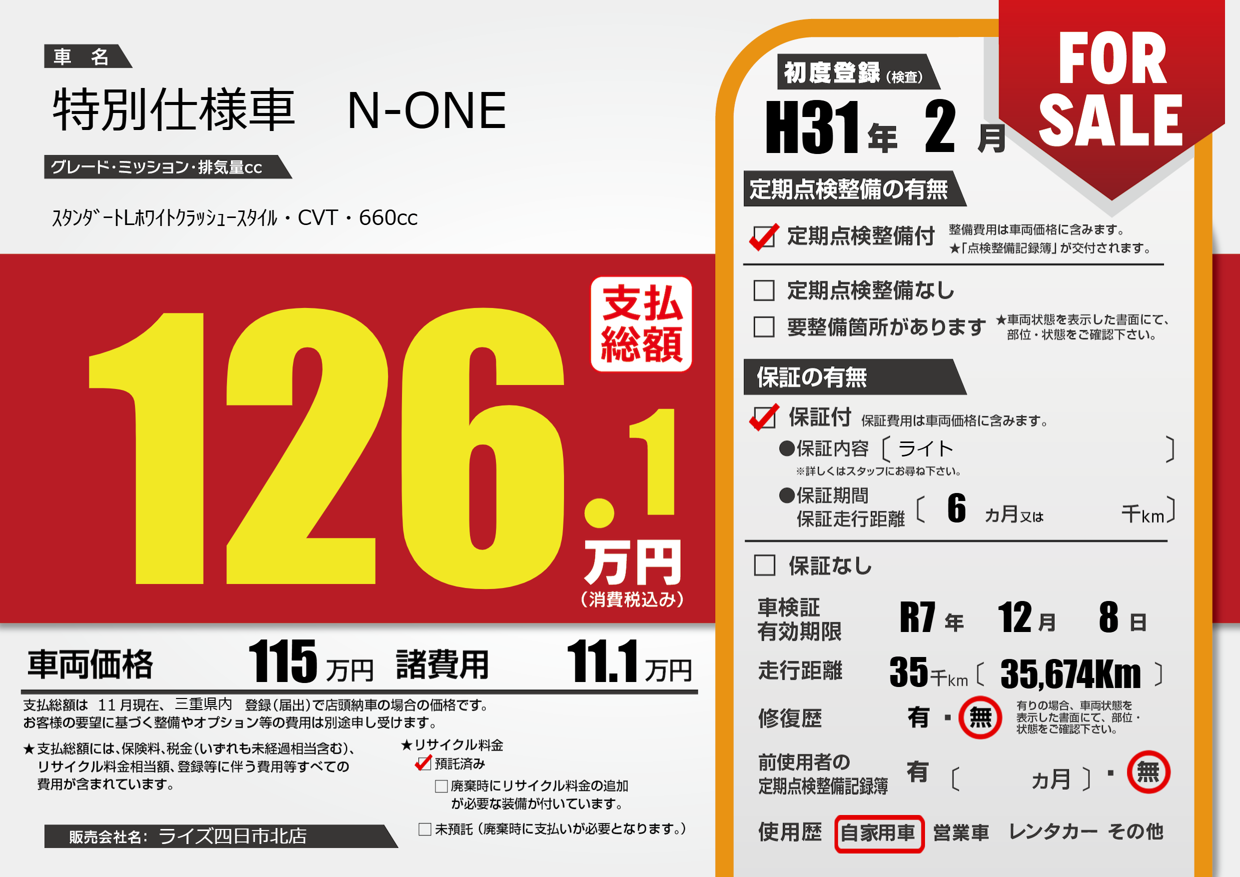 | 車名 | 特別仕様車 N-ONE | グレード ミッション 排気量 |
