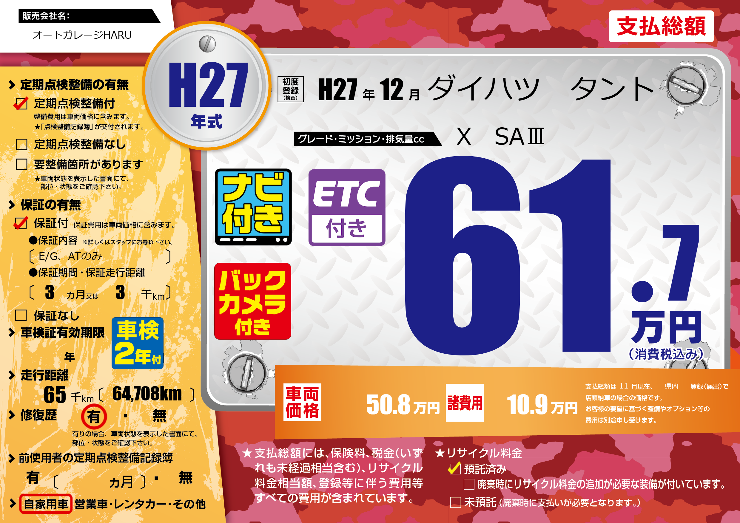 | 車名 | ダイハツ タント | グレード ミッション 排気量 |