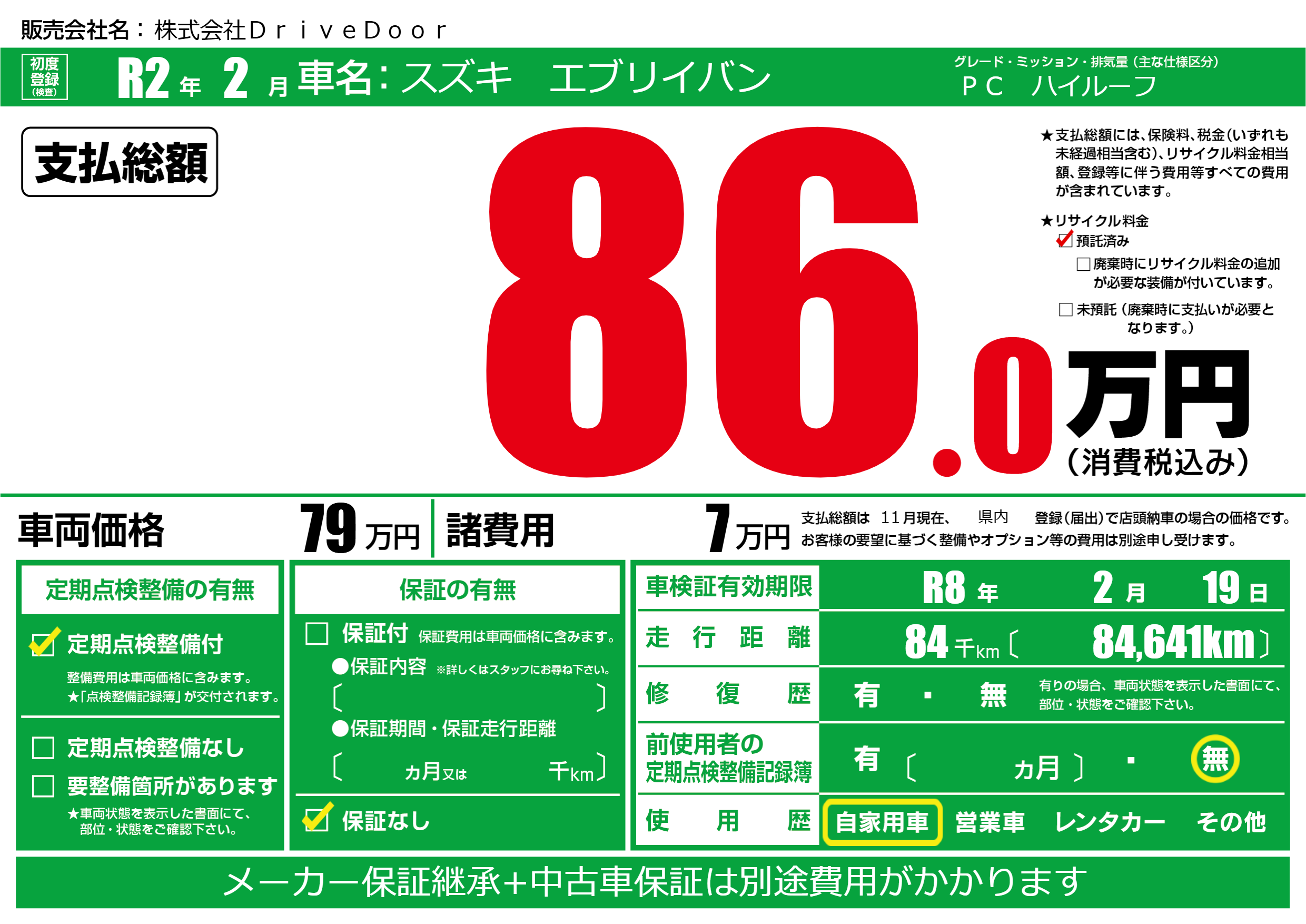 | 定期点検整備 | 定期点検整備あり | ||