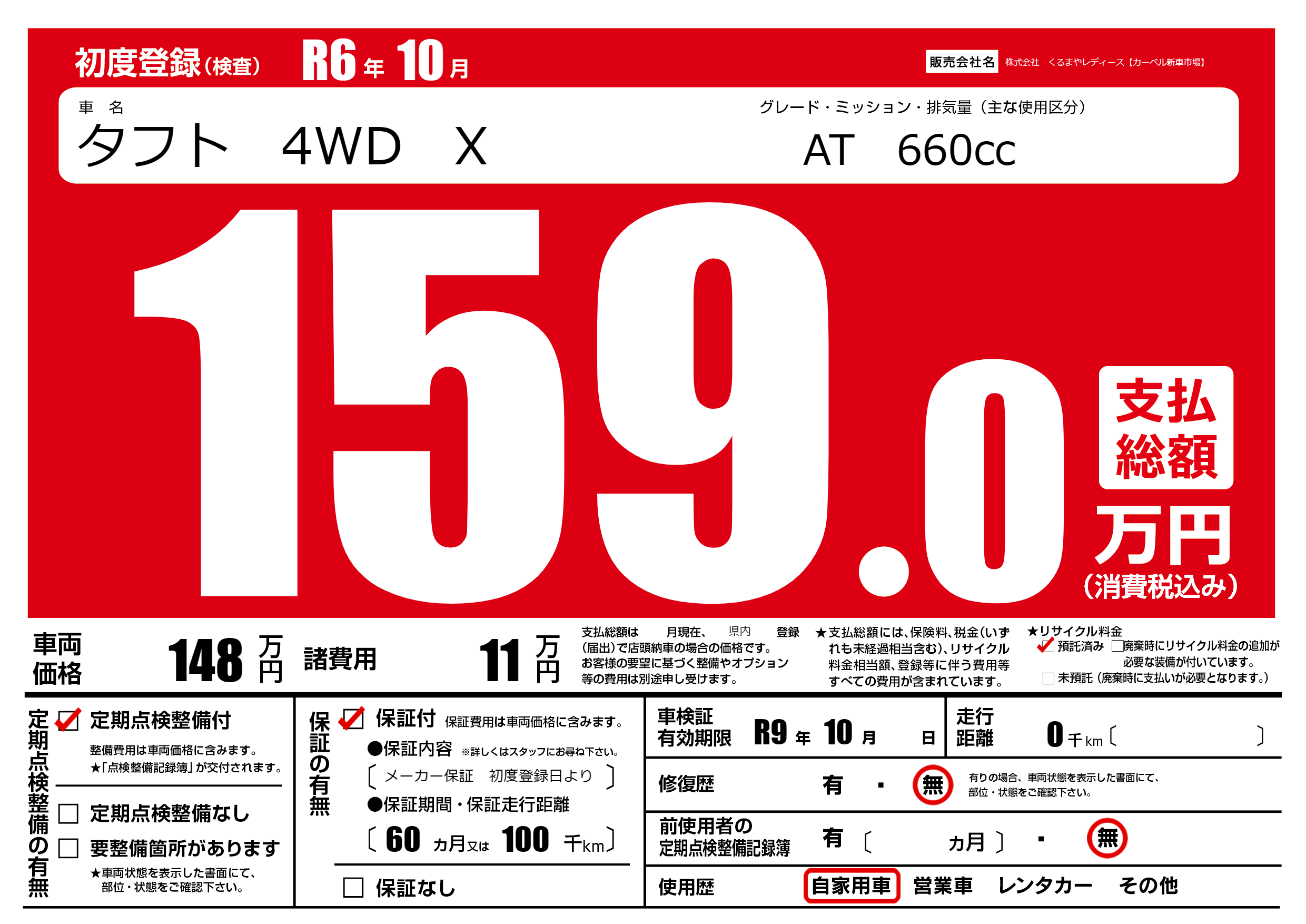 | 車名 | タフト 4WD X | グレード ミッション 排気量 |