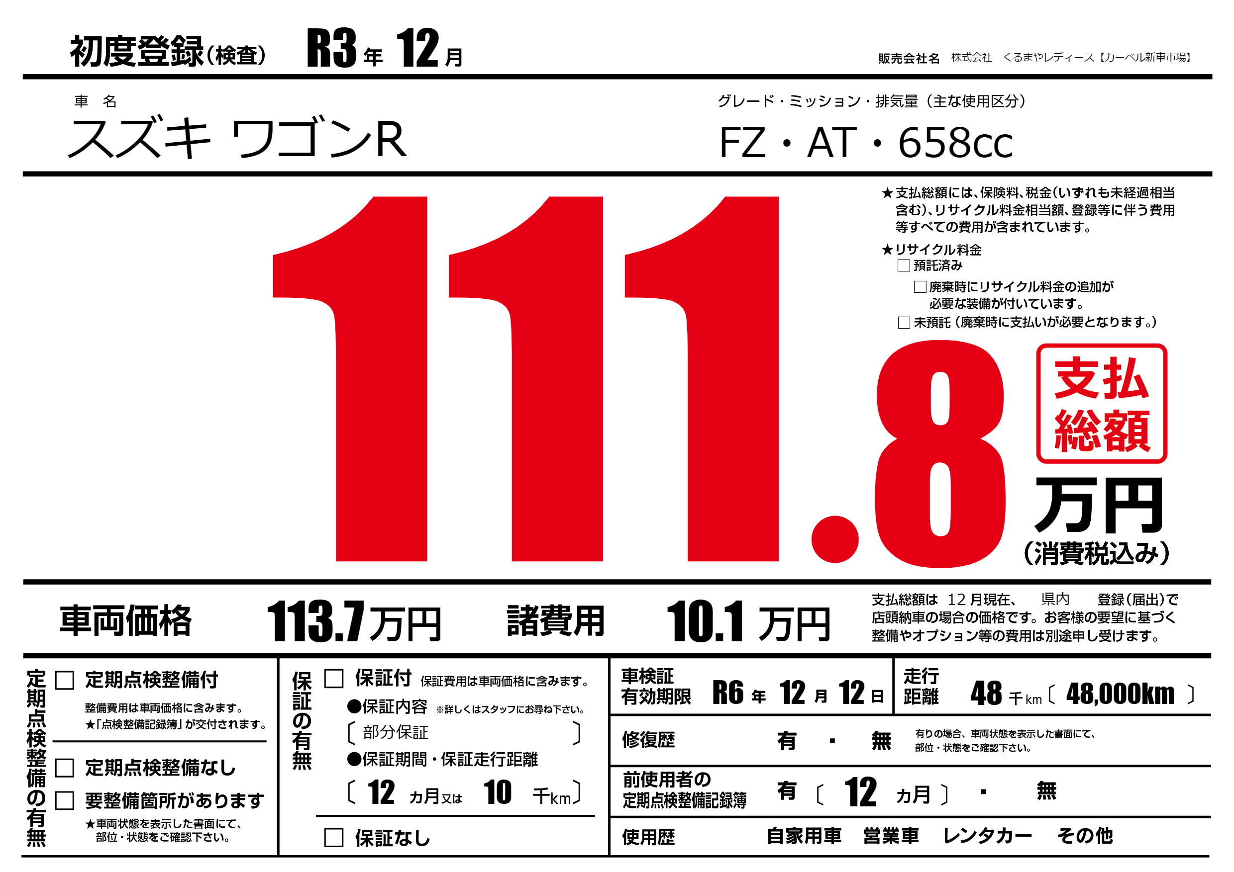 | 走行キロ | 4.8万km | 初年度登録 | R3年12月 |
