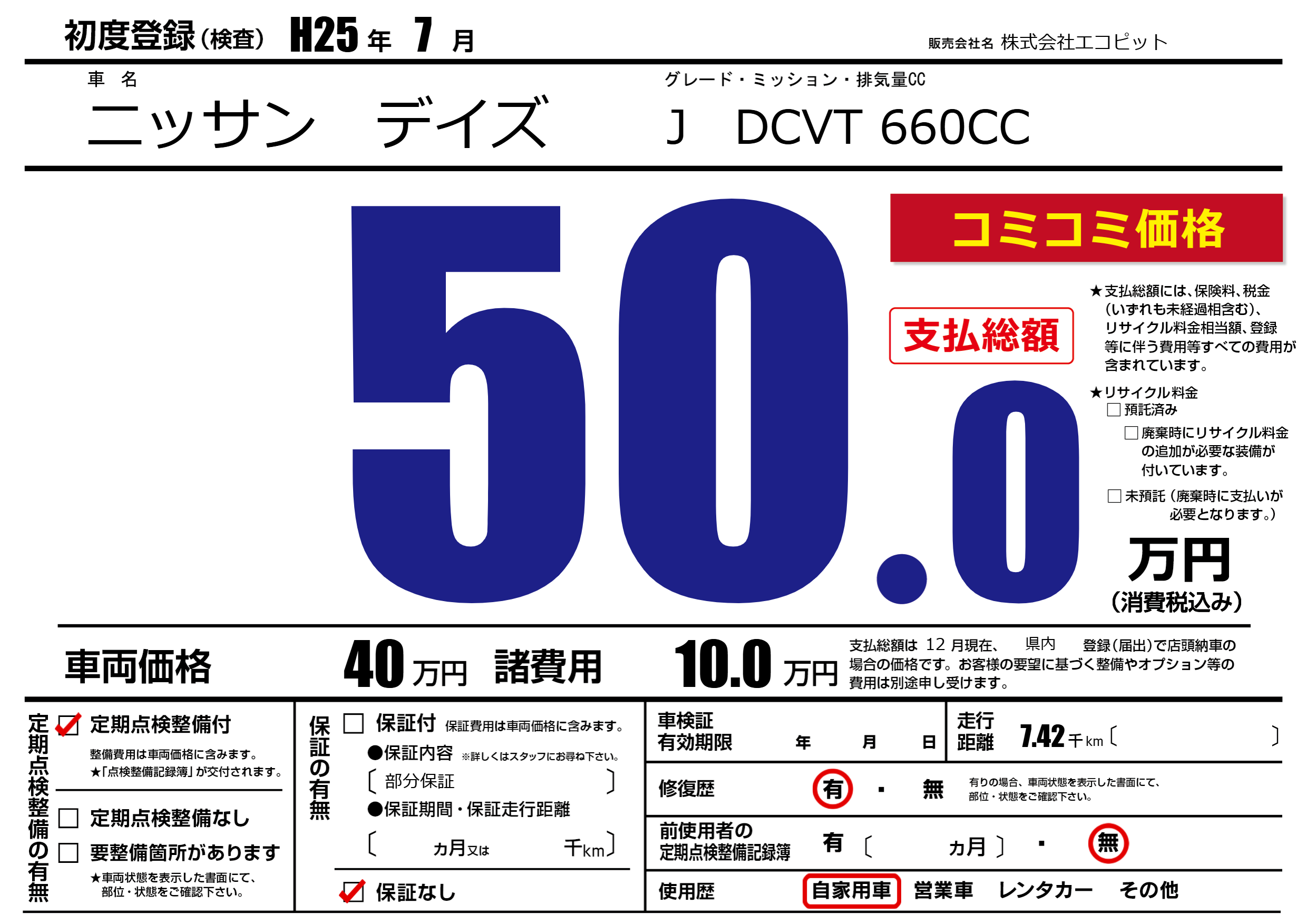 | 車名 | ニッサン デイズ | グレード ミッション 排気量 |