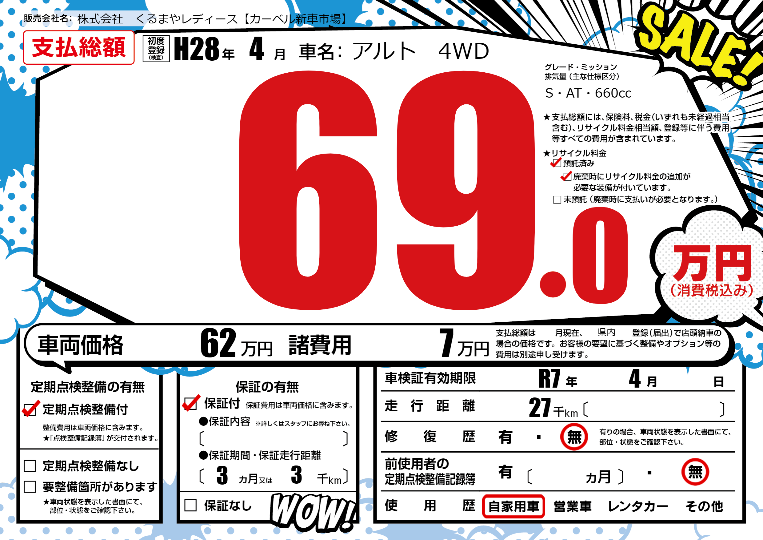 | 車名 | アルト 4WD | グレード ミッション 排気量 |
