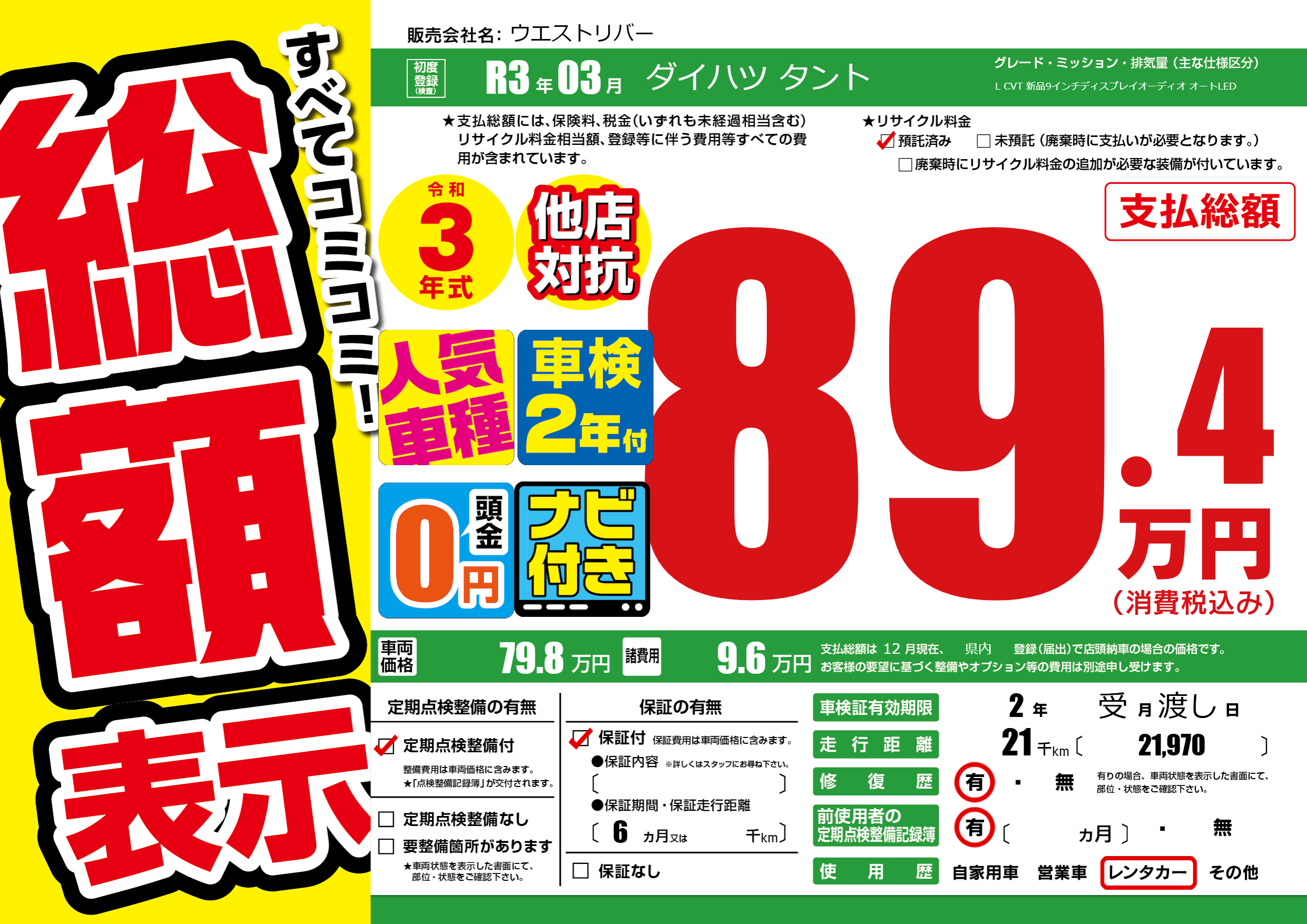 | 車名 | ダイハツ タント | グレード ミッション 排気量 |