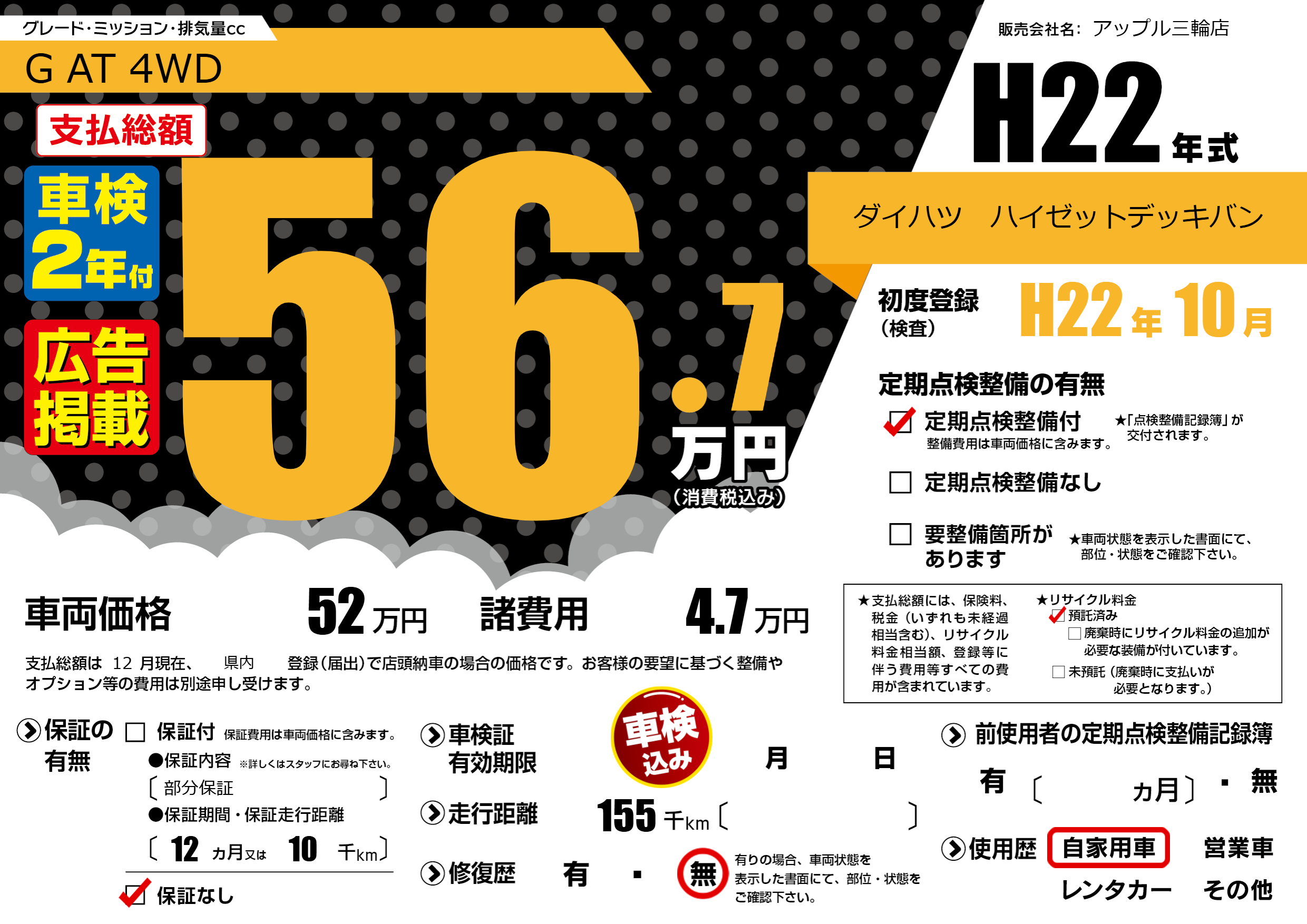 | 走行キロ | 15.5万km | 初年度登録 | H22年10月 |