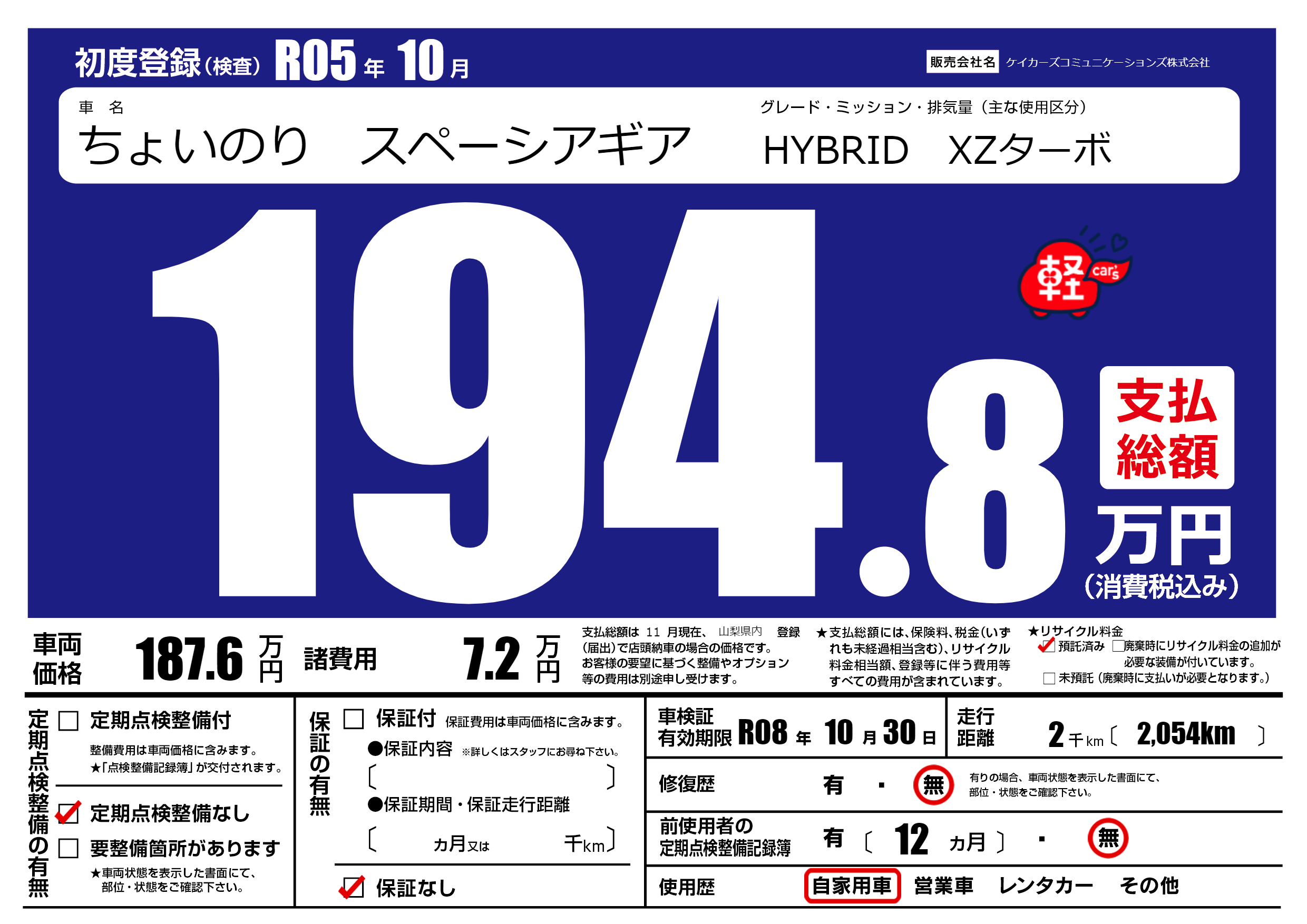 | 走行キロ | 0.2万km | 初年度登録 | R05年10月 |