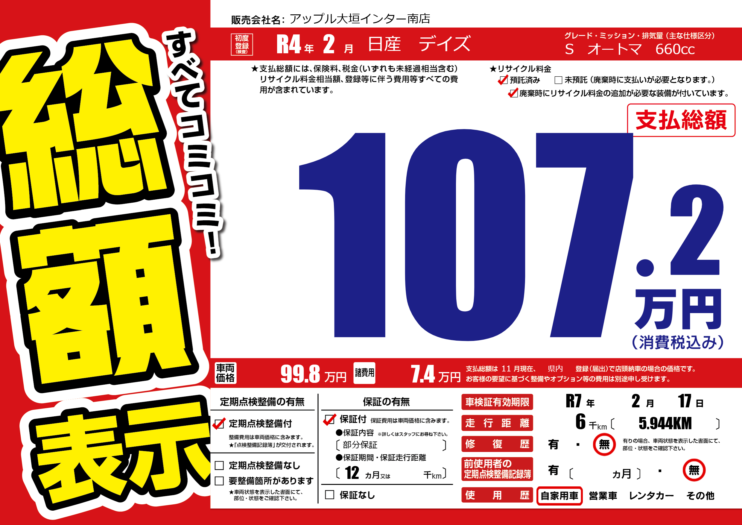 なし | 車検制限 | R7年2月17月 |