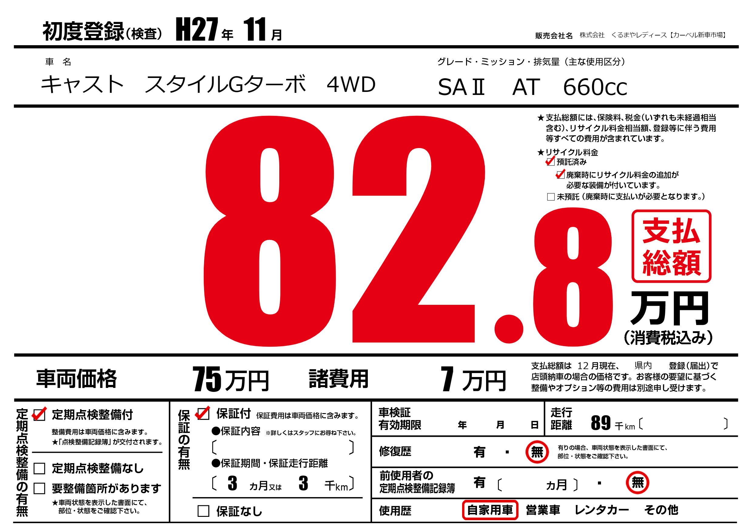 保証付き 保証内容(---) 3ヶ月または(3)千kmまで |