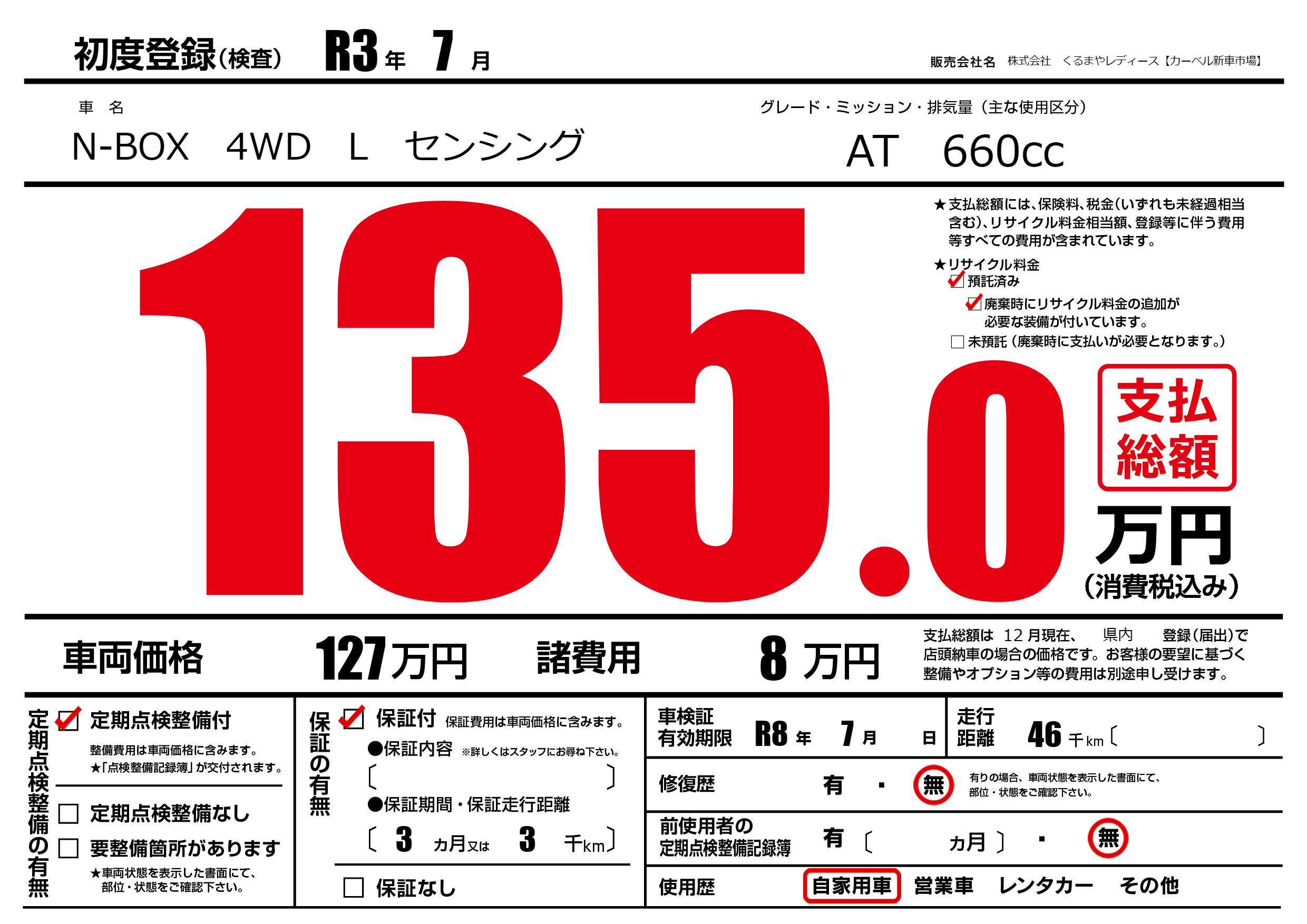 保証付き 保証内容(---) 3ヶ月または(3)千kmまで |