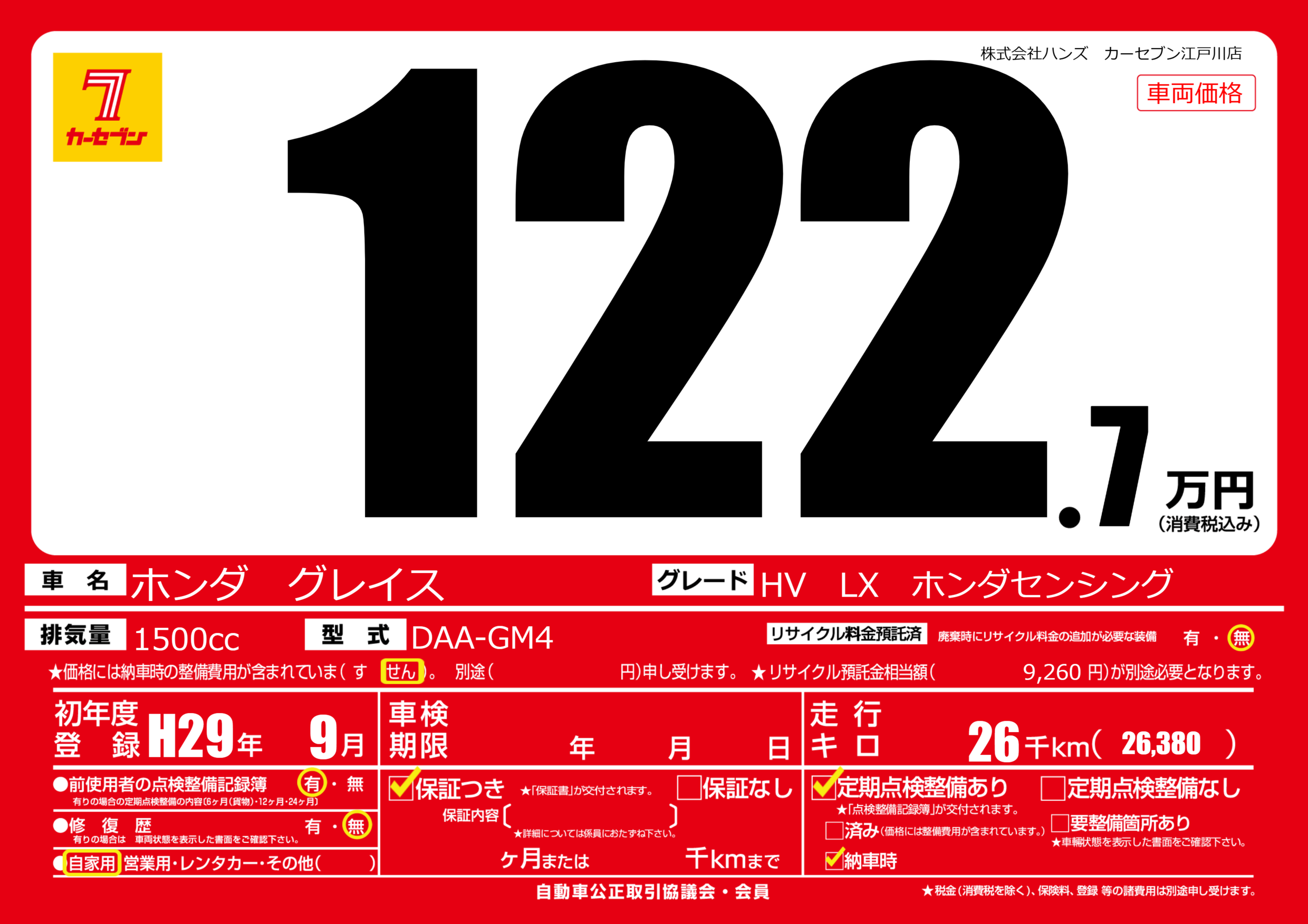 | 車名 | ホンダ グレイス | グレード ミッション 排気量 |