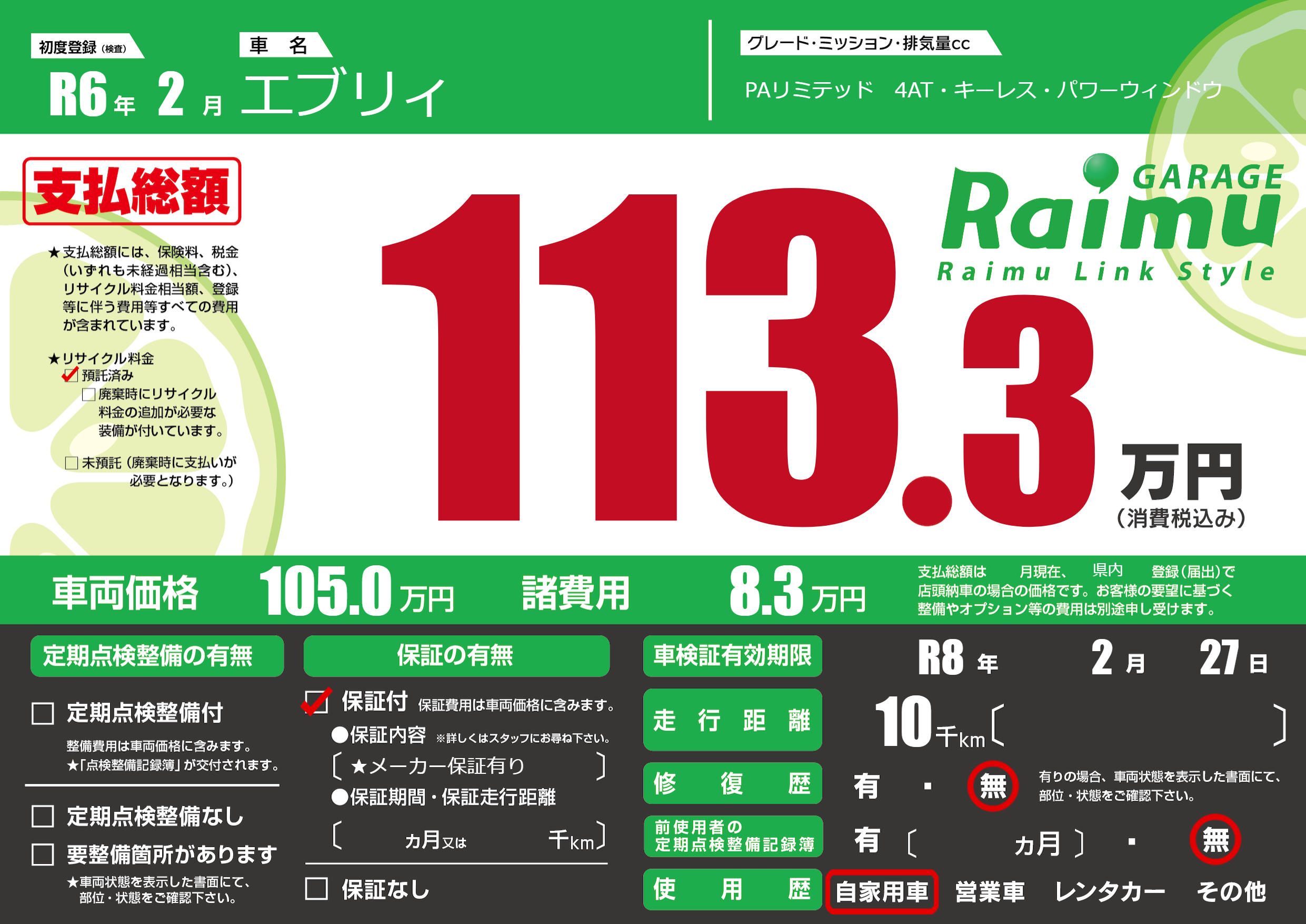 | 車名 | エブリィ | グレード ミッション 排気量 |