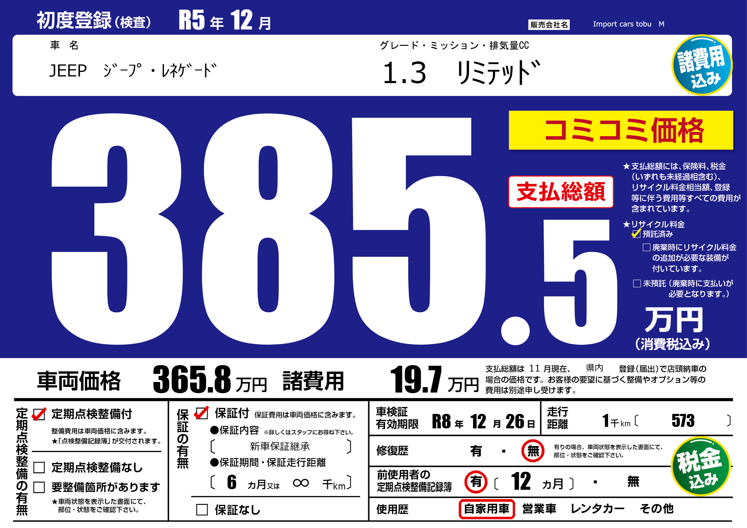 | 車名 | JEEP ジープ・レネゲード | グレード ミッション 排気量 |