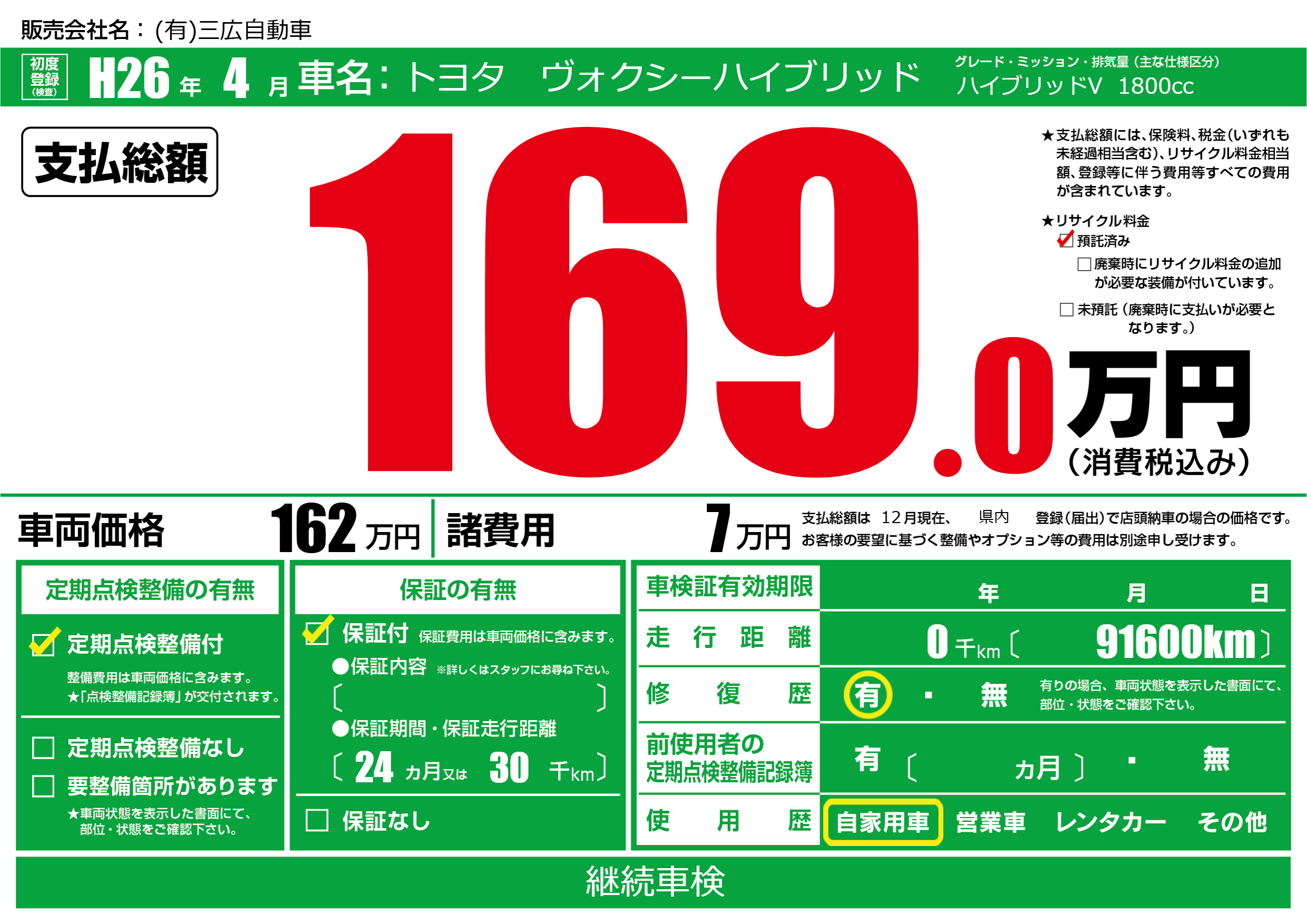 | 車名 | トヨタ ヴォクシーハイブリッド | グレード ミッション 排気量 |