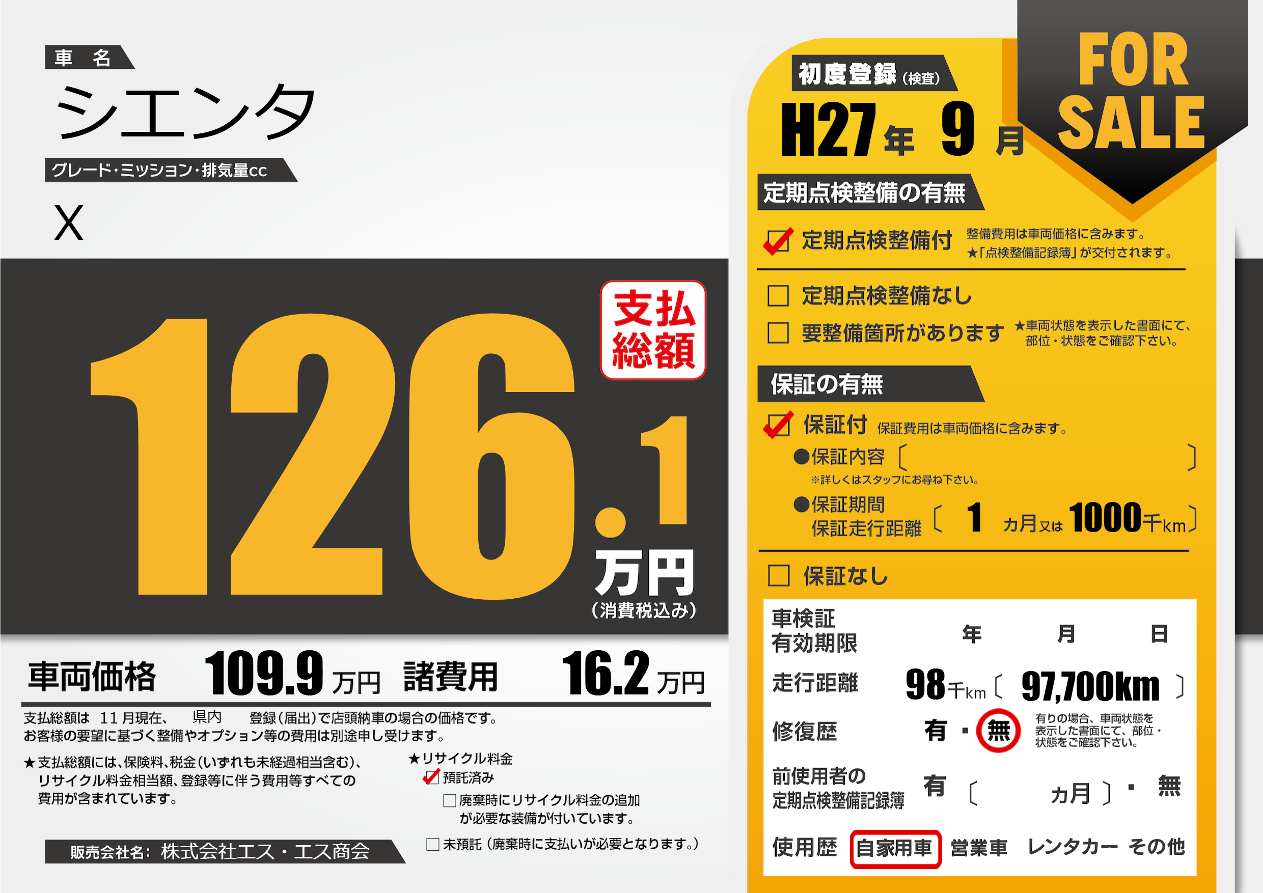 | 車名 | シエンタ | グレード ミッション 排気量 |