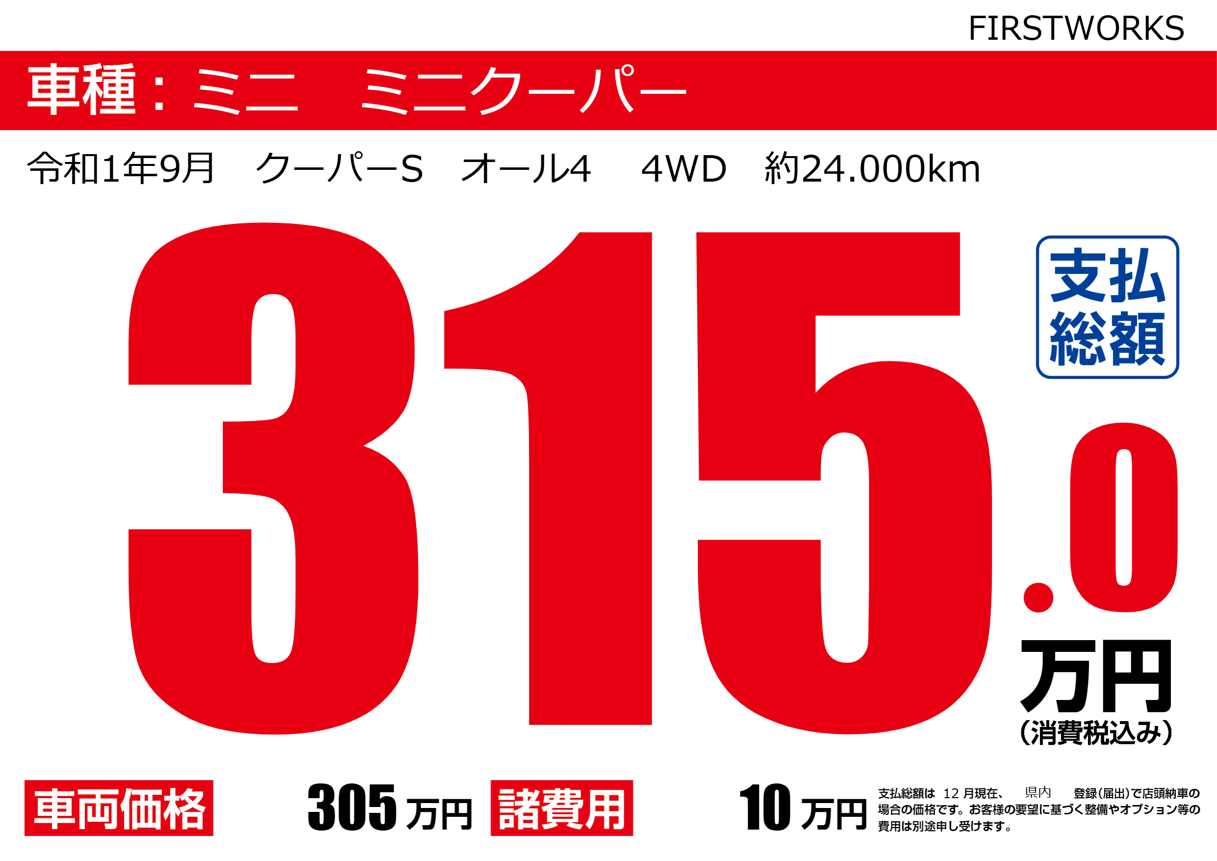 令和1年9月 クーパーS オール4 4WD 約24.000km |