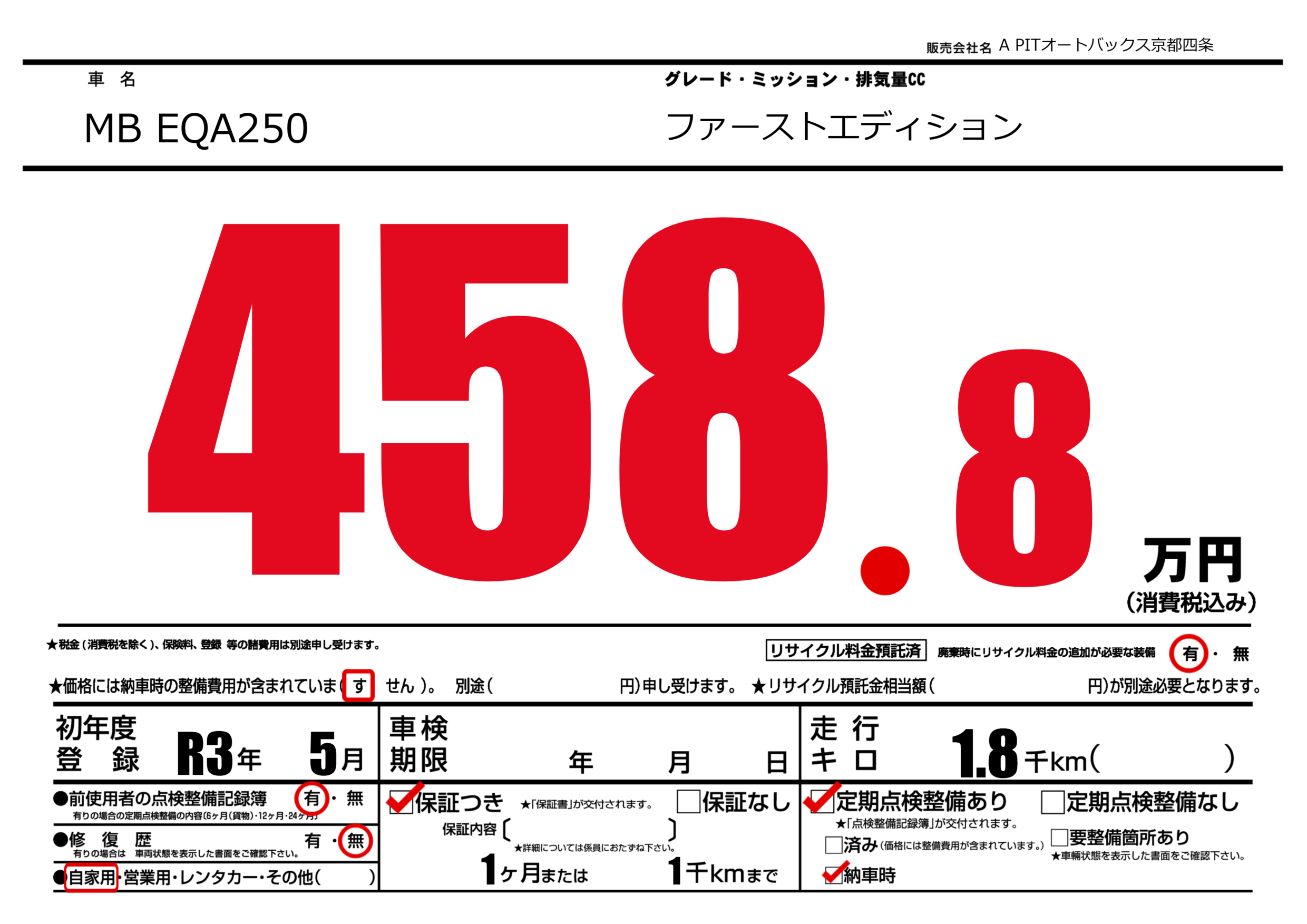 | 走行キロ | 0.1万km | 初年度登録 | R3年5月 |