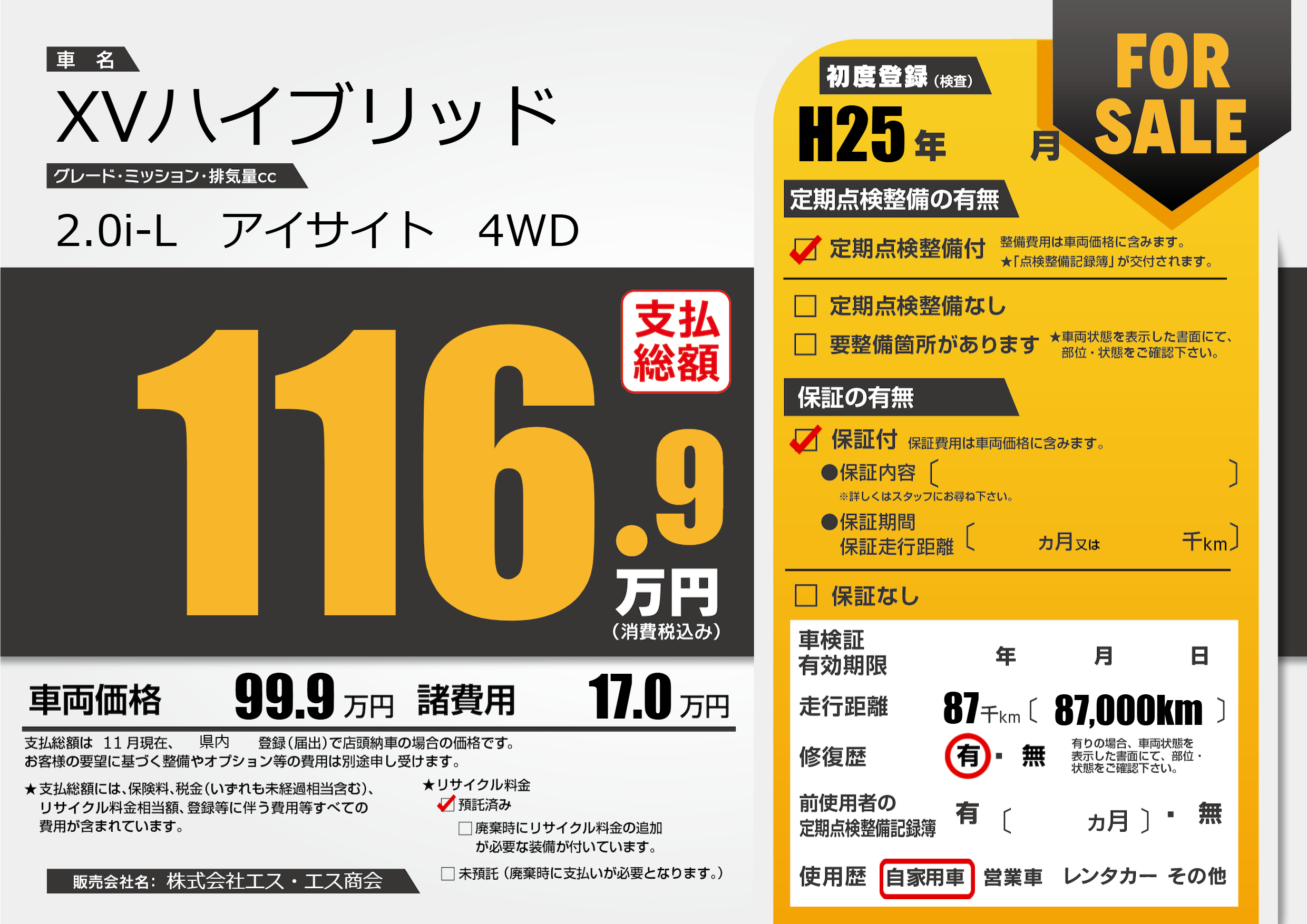 | 車名 | XVハイブリッド | グレード ミッション 排気量 |