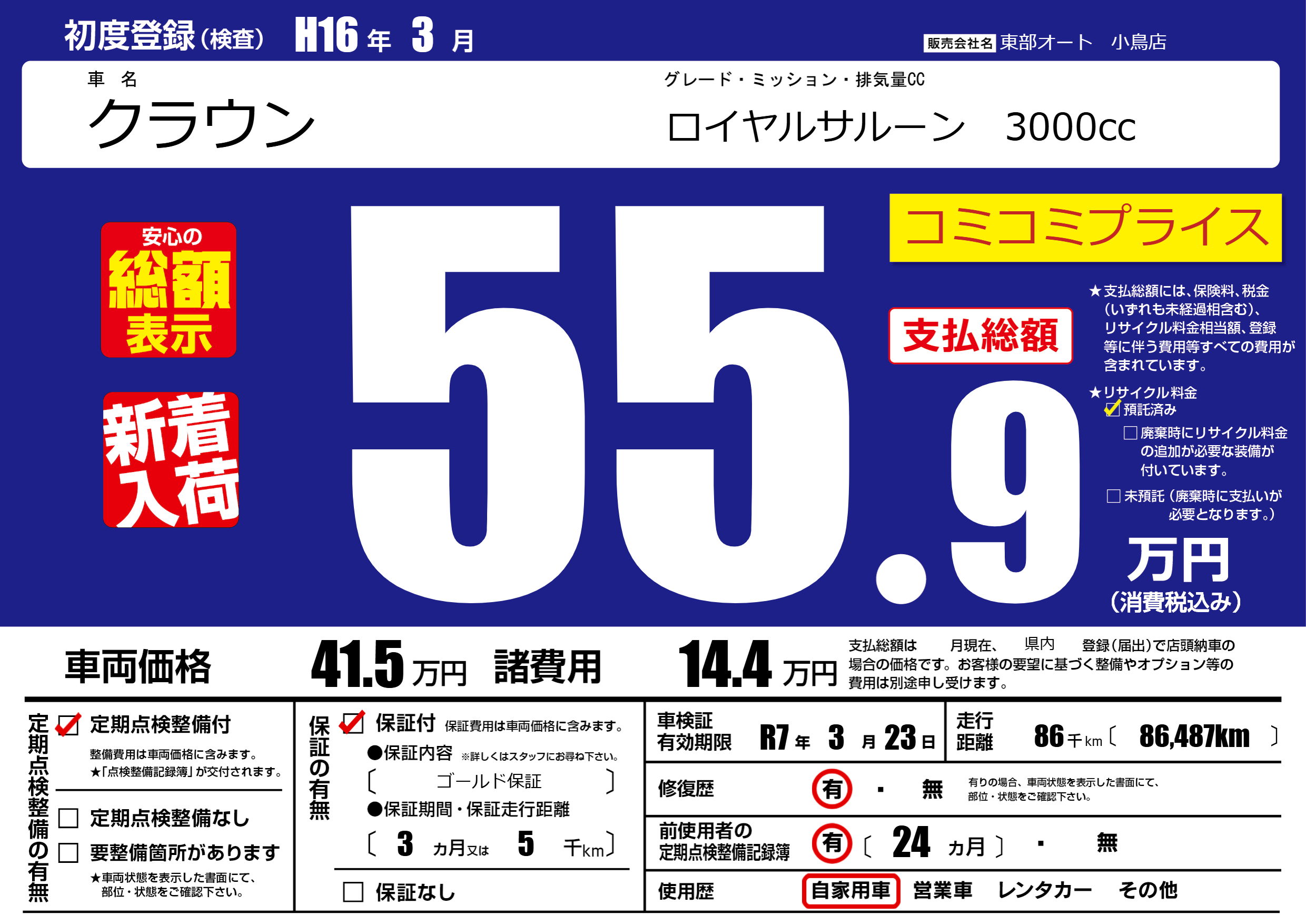 | 走行キロ | 8.6万km | 初年度登録 | H16年3月 |