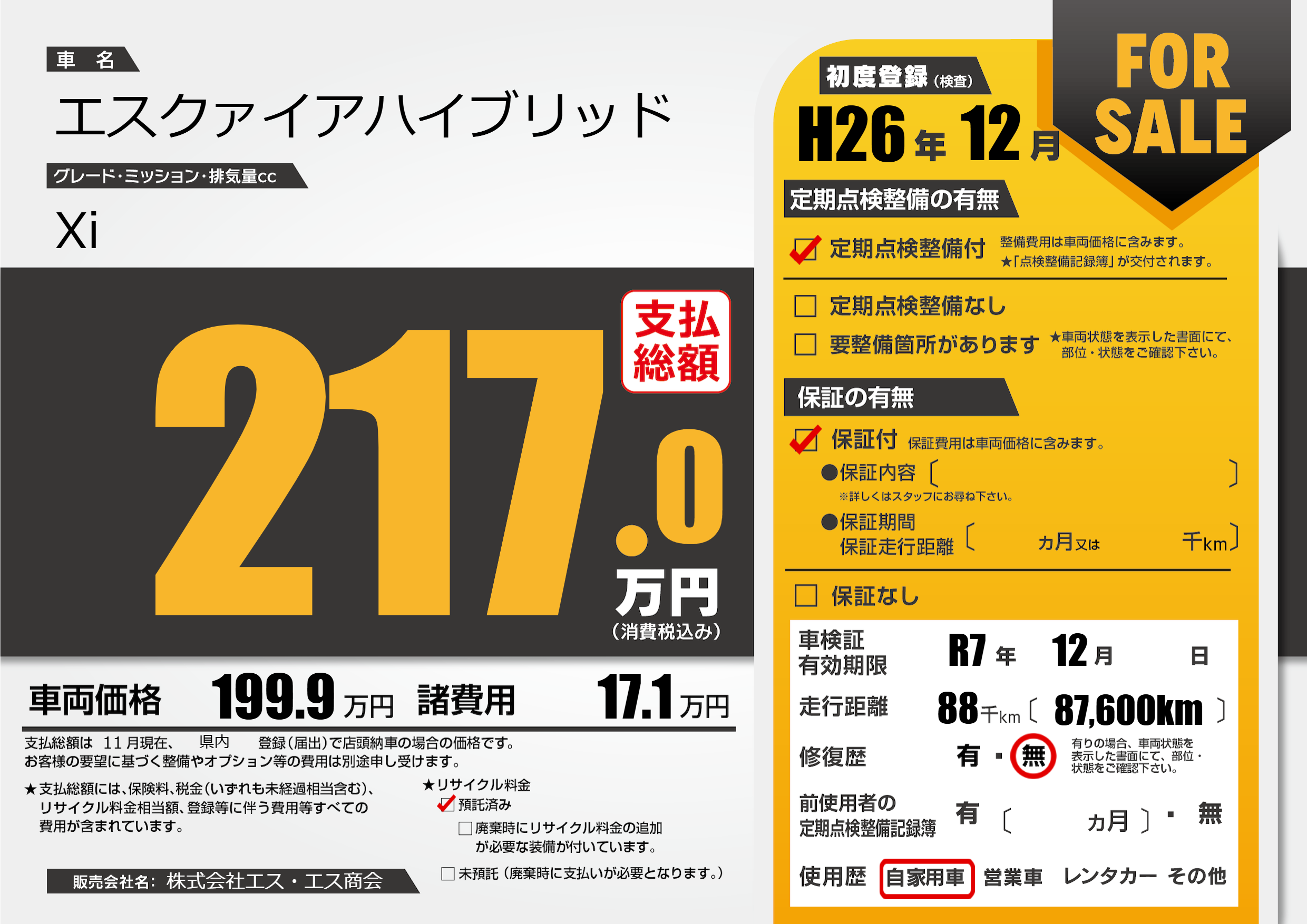 | 走行キロ | 8.8万km | 初年度登録 | H26年12月 |