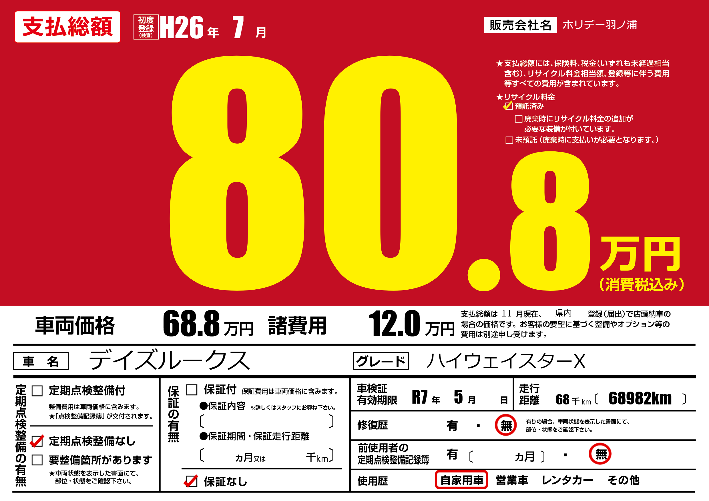 | 走行キロ | 6.8万km | 初年度登録 | H26年7月 |