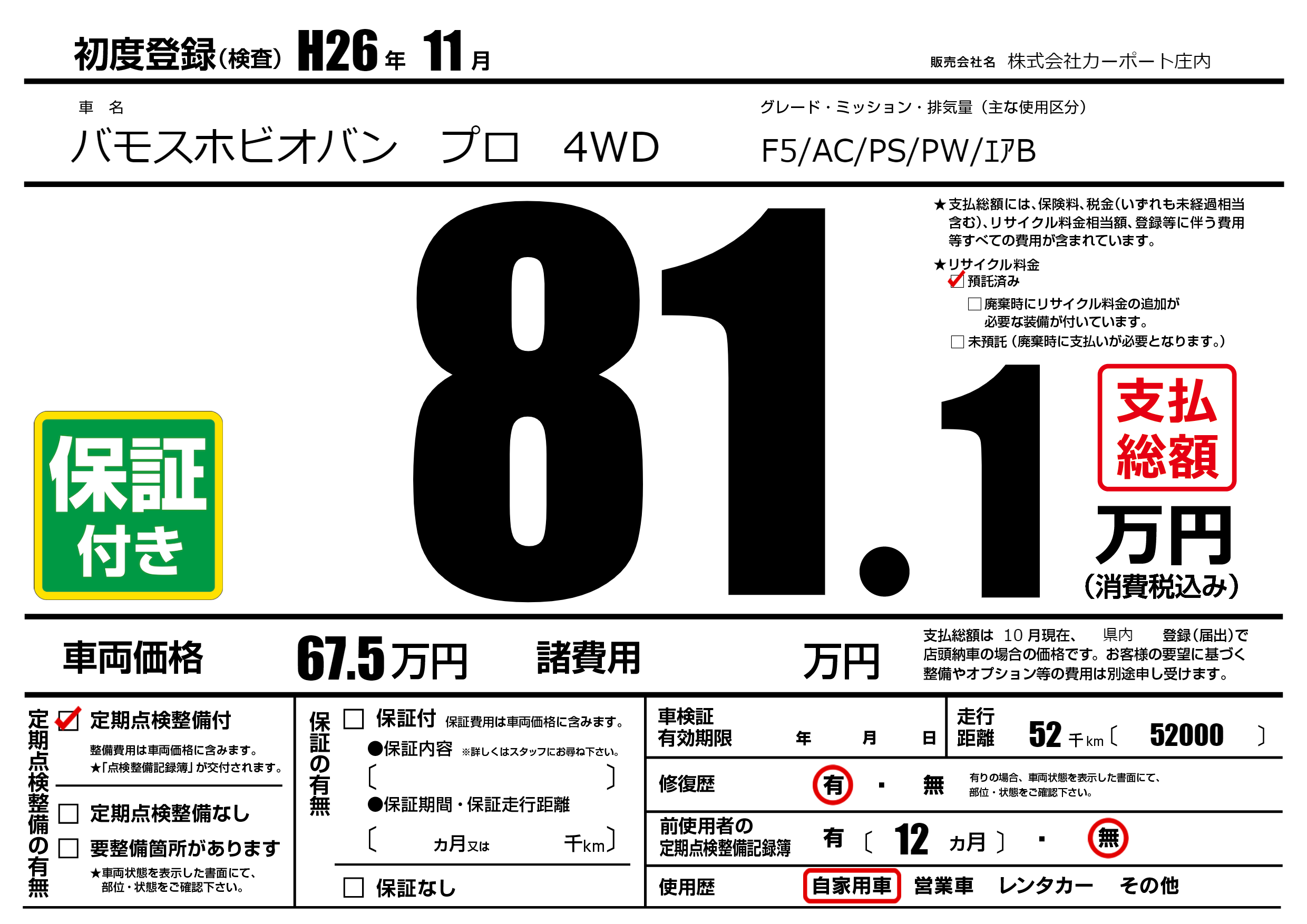 | 車名 | バモスホビオバン プロ 4WD | グレード ミッション 排気量 |