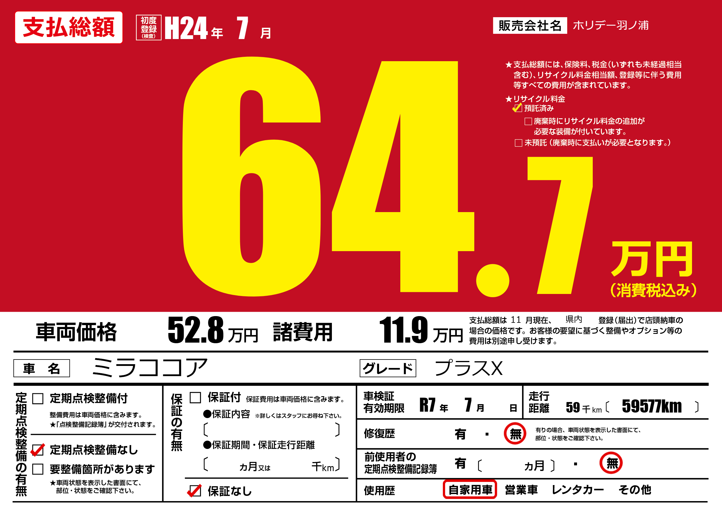 | 走行キロ | 5.9万km | 初年度登録 | H24年7月 |