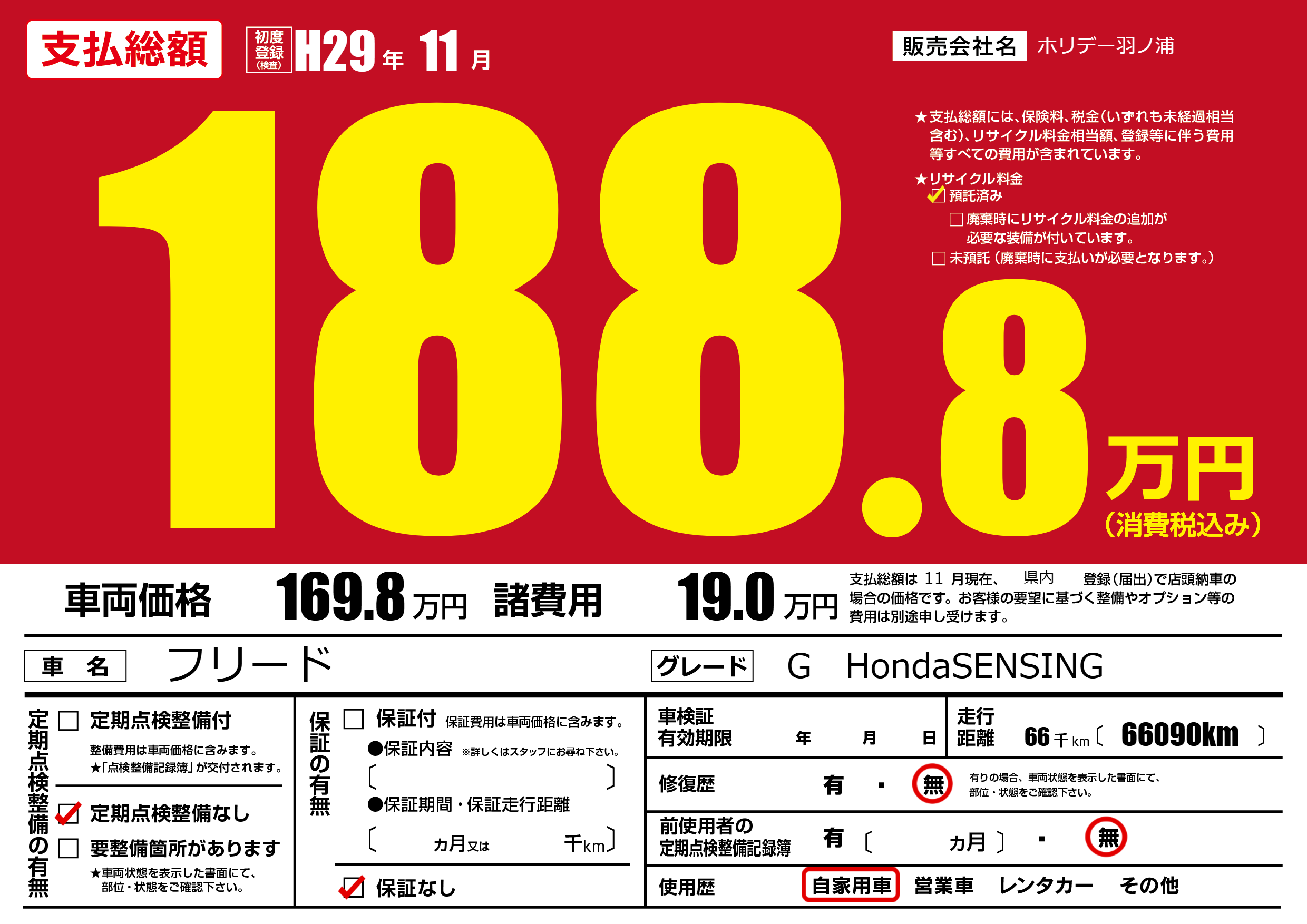 | 車名 | フリード | グレード ミッション 排気量 |