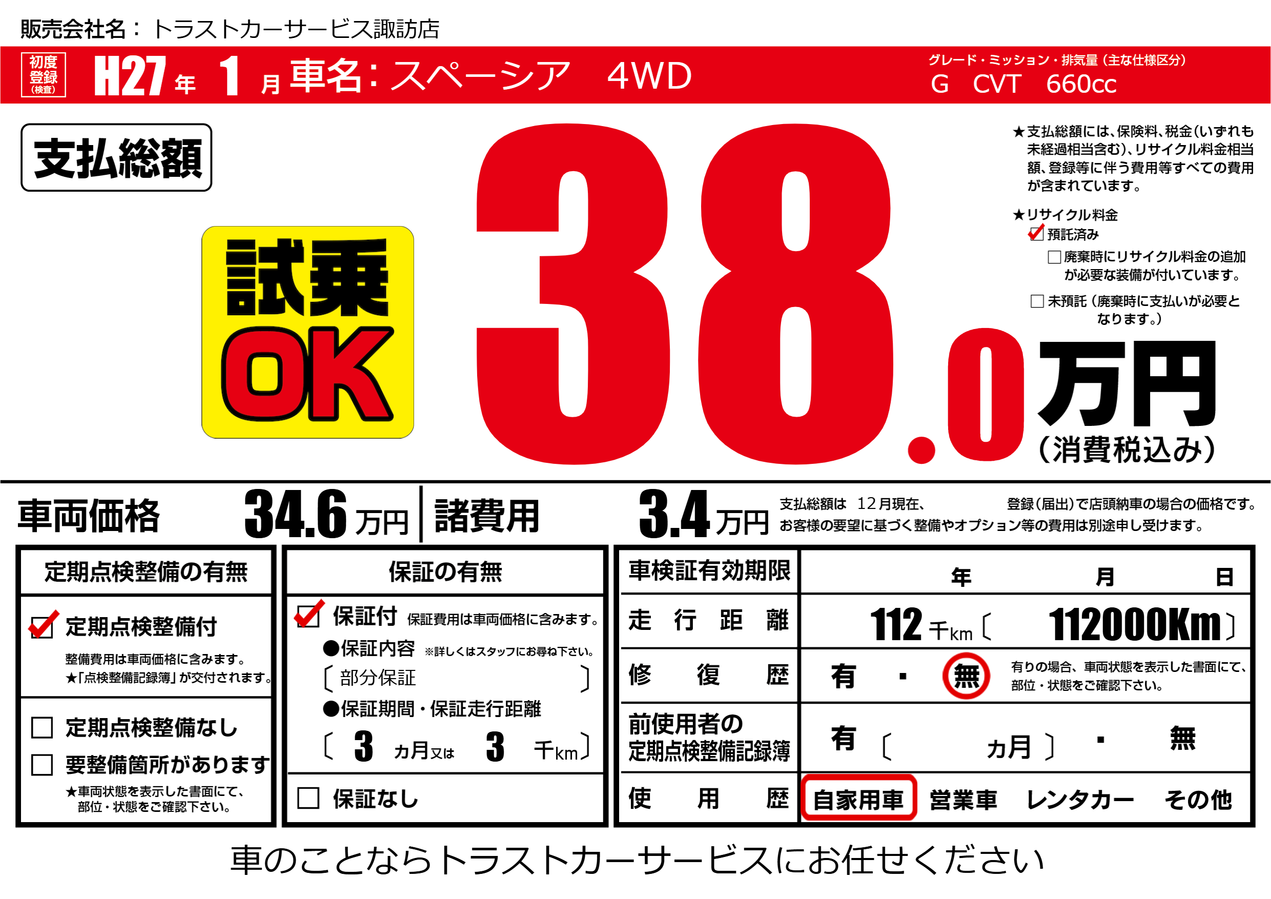 | 車名 | スペーシア 4WD | グレード ミッション 排気量 |