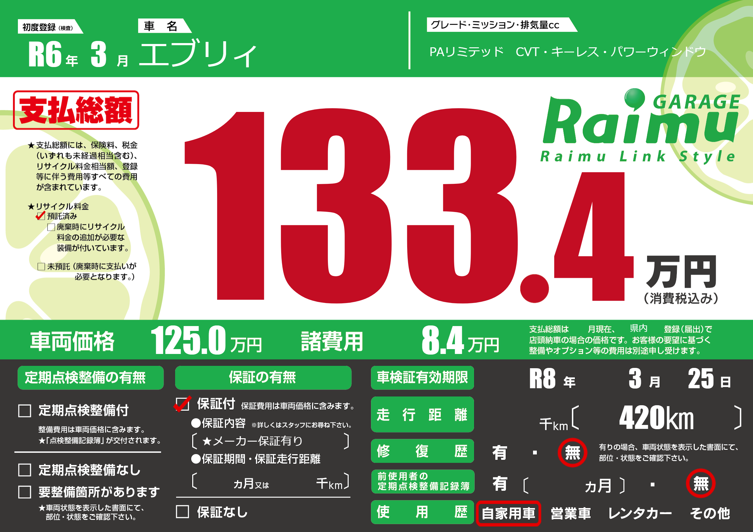 | 車名 | エブリィ | グレード ミッション 排気量 |