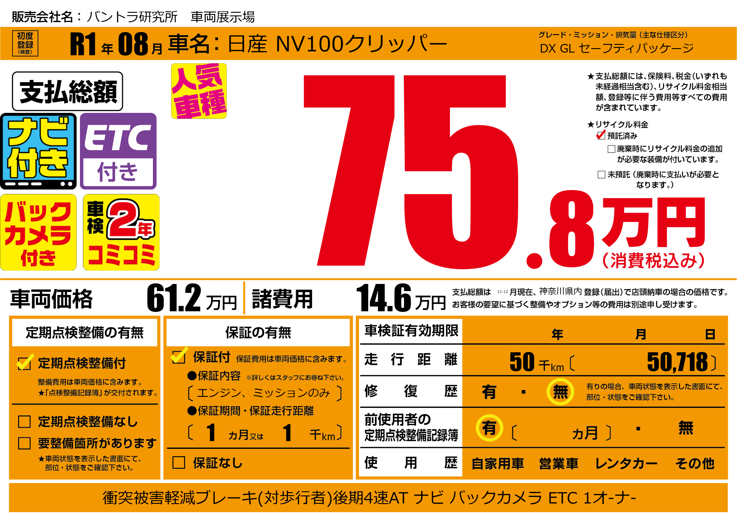 | 車名 | 日産 NV100クリッパー | グレード ミッション 排気量 |