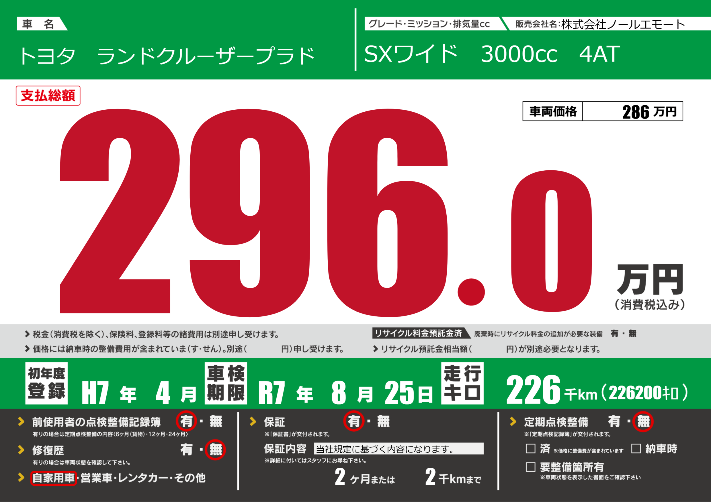 | 走行キロ | 22.6万km | 初年度登録 | H7年4月 |