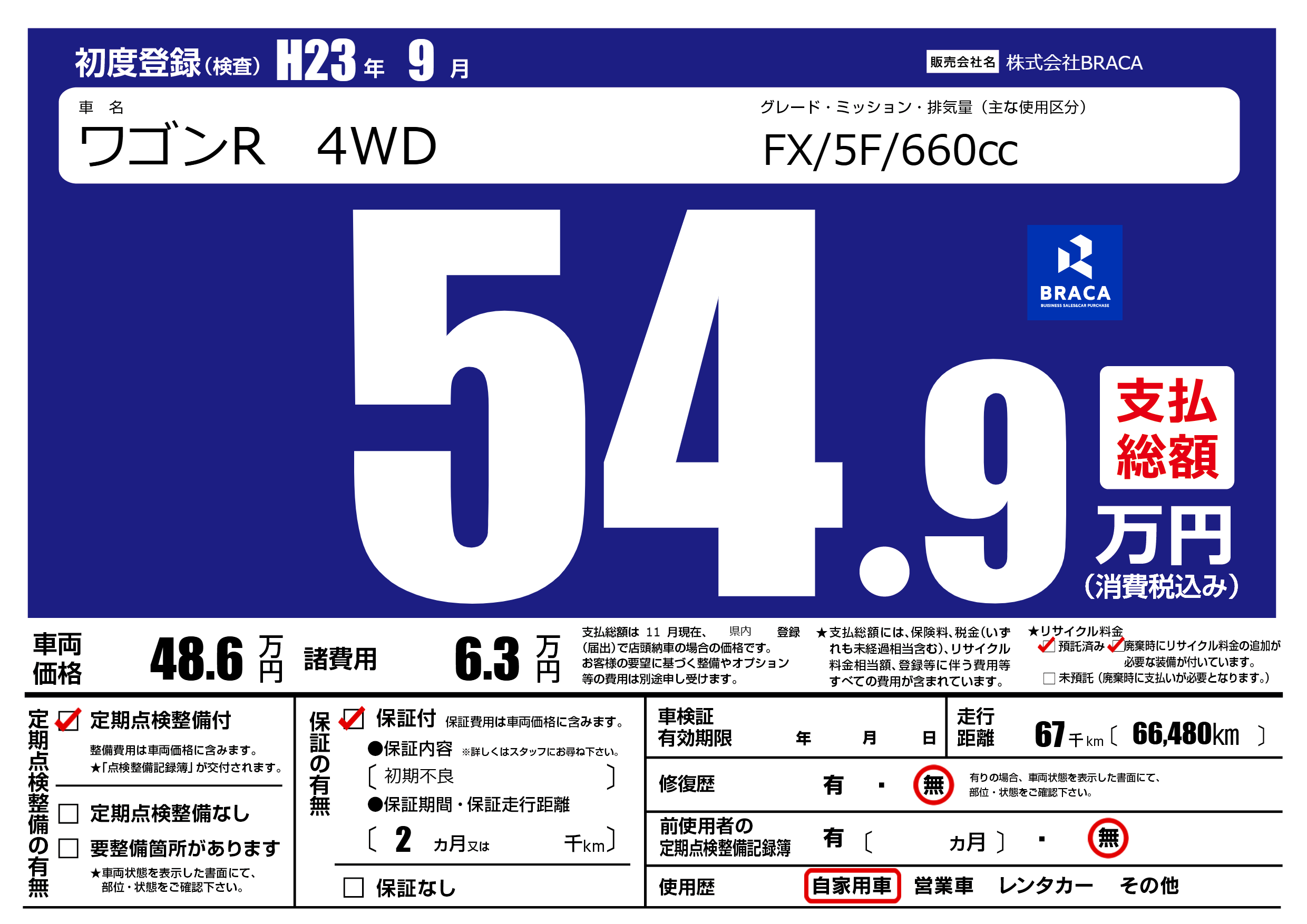 | 走行キロ | 6.7万km | 初年度登録 | H23年9月 |