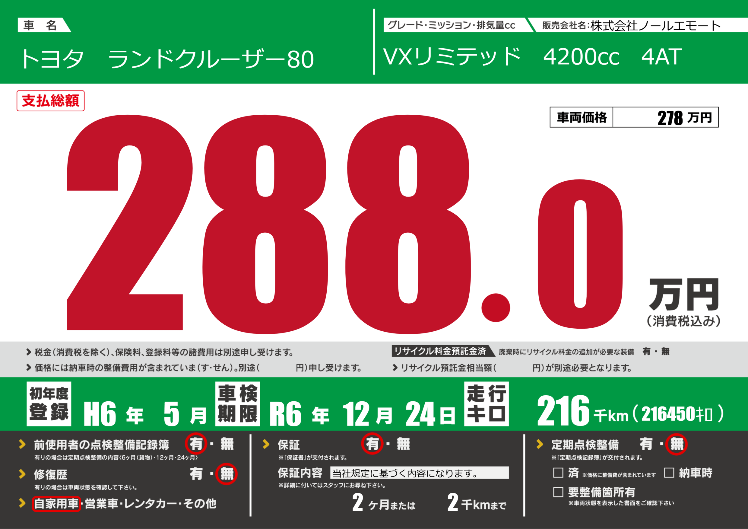 | 車名 | トヨタ ランドクルーザー80 | グレード ミッション 排気量 |