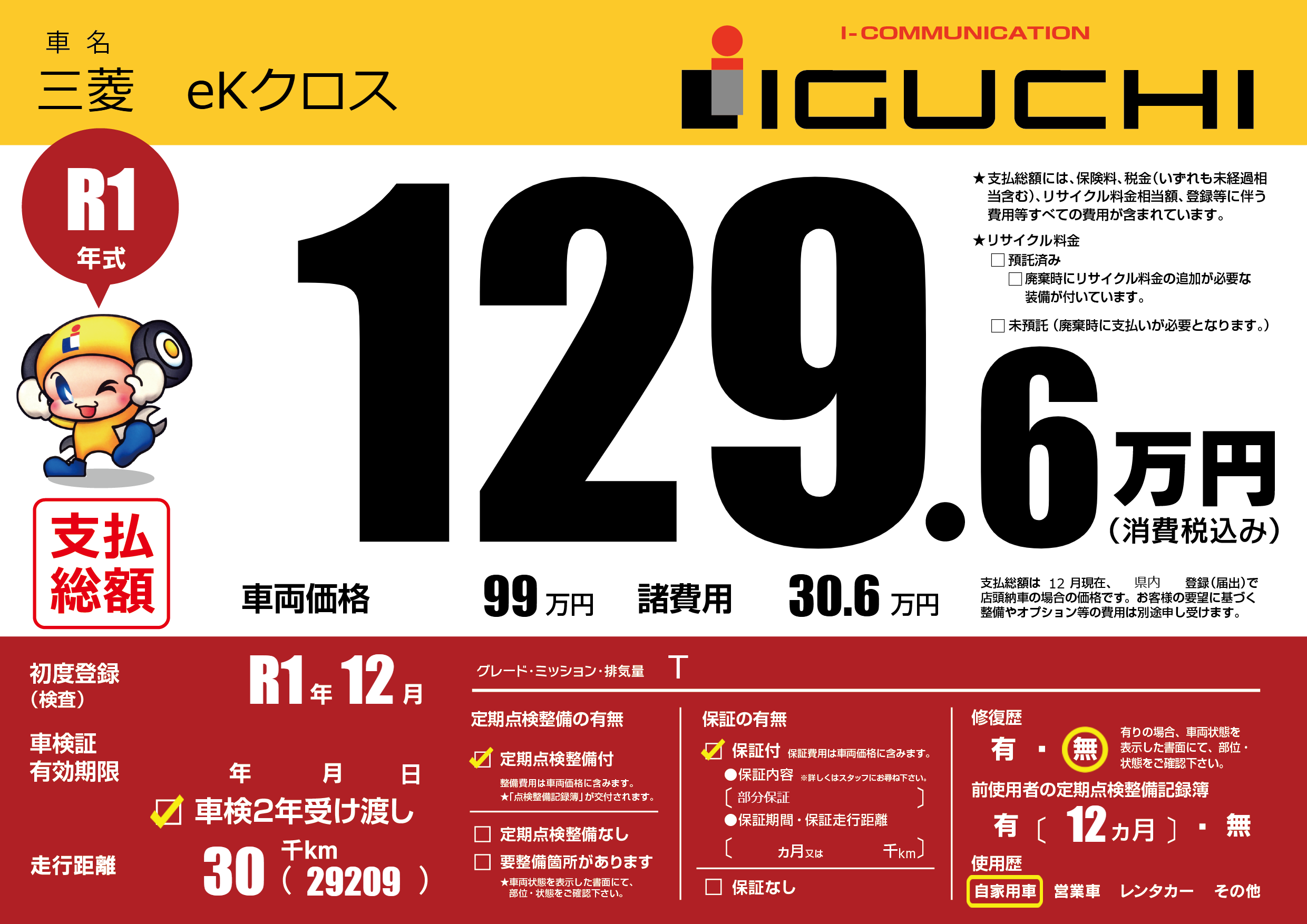 | 走行キロ | 3万km | 初年度登録 | R1年12月 |