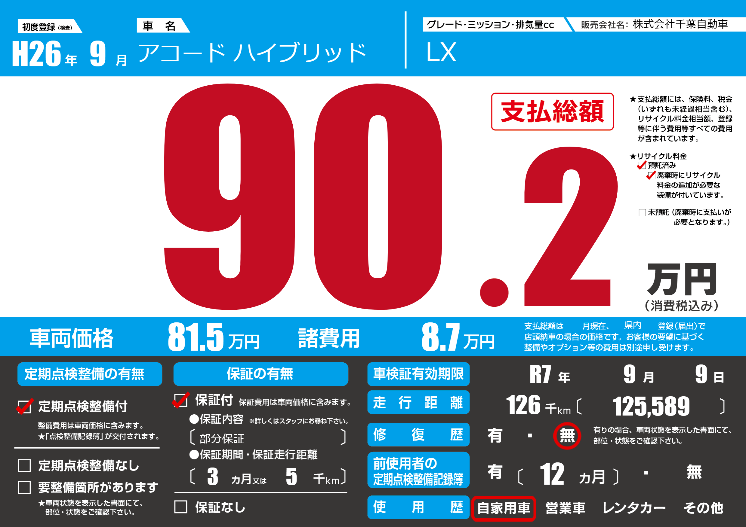 | 走行キロ | 12.6万km | 初年度登録 | H26年9月 |