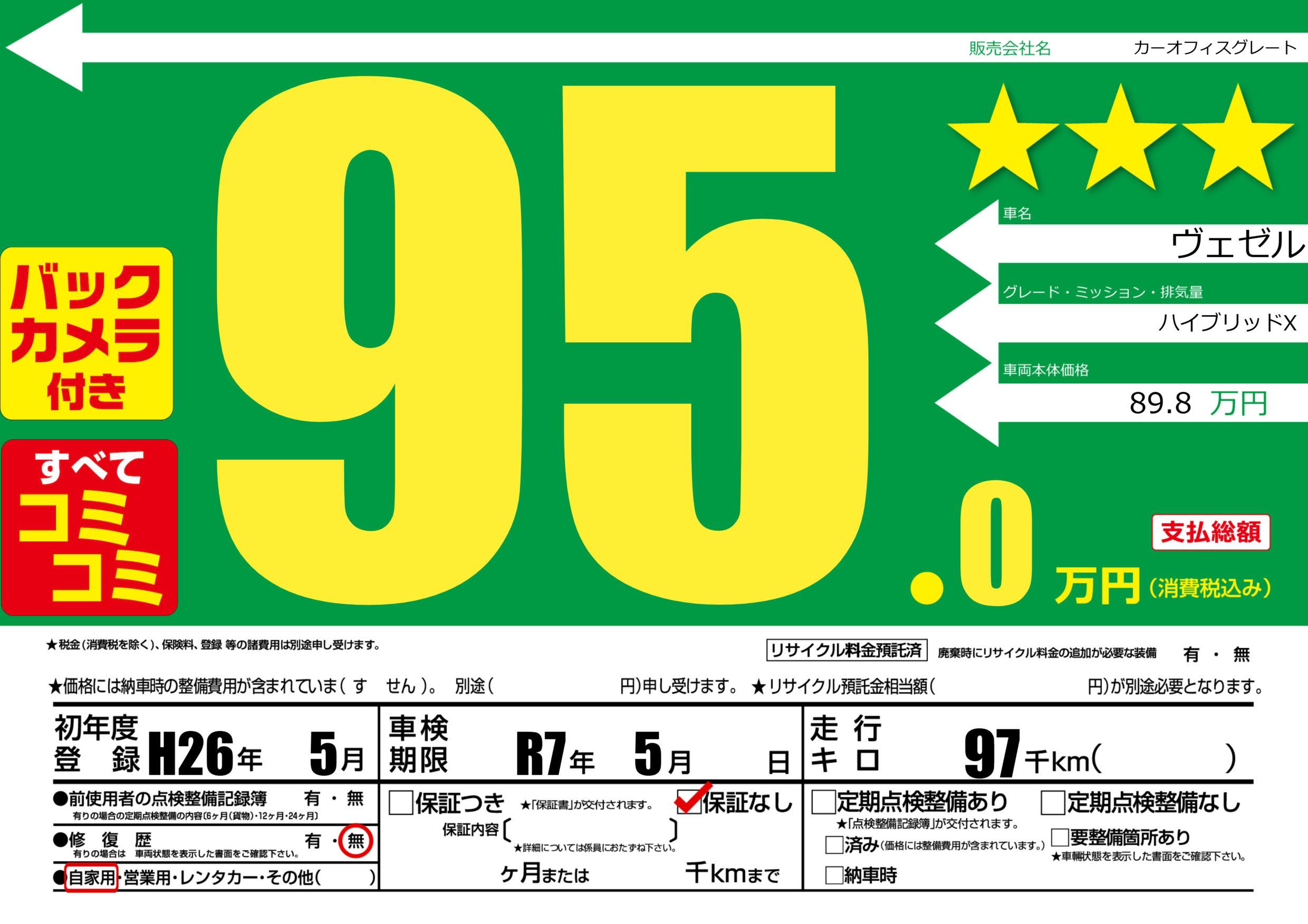 | 走行キロ | 9.7万km | 初年度登録 | H26年5月 |