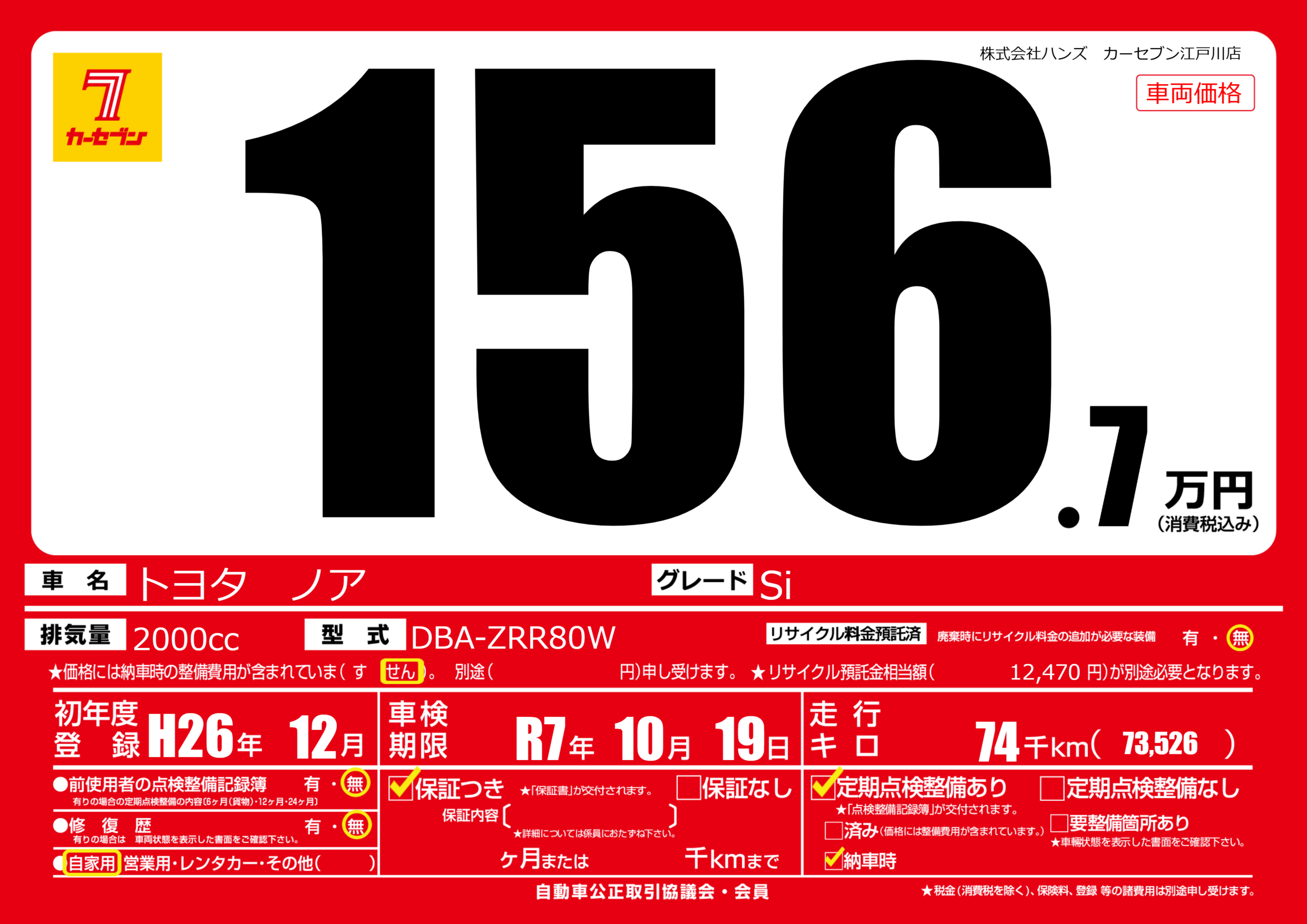 | 走行キロ | 7.4万km | 初年度登録 | H26年12月 |