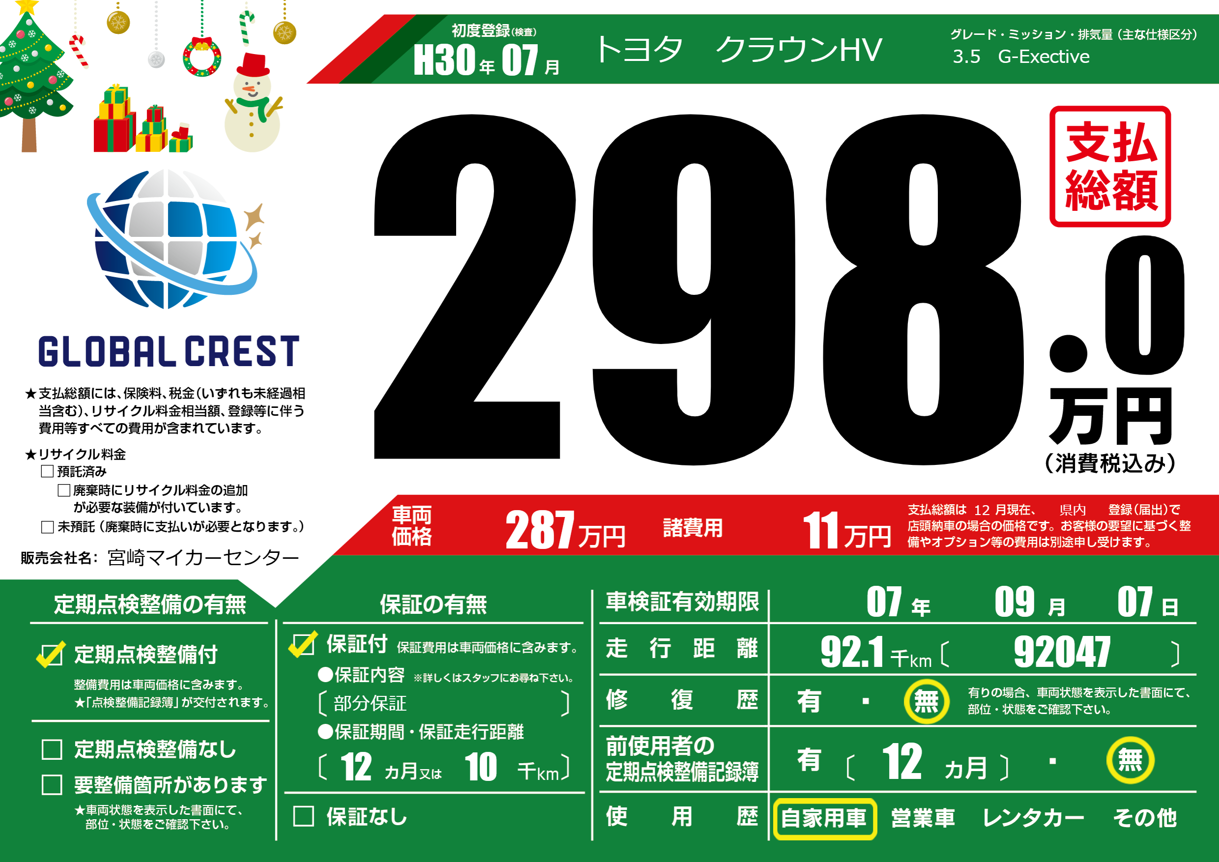 | 車名 | トヨタ クラウンHV | グレード ミッション 排気量 |