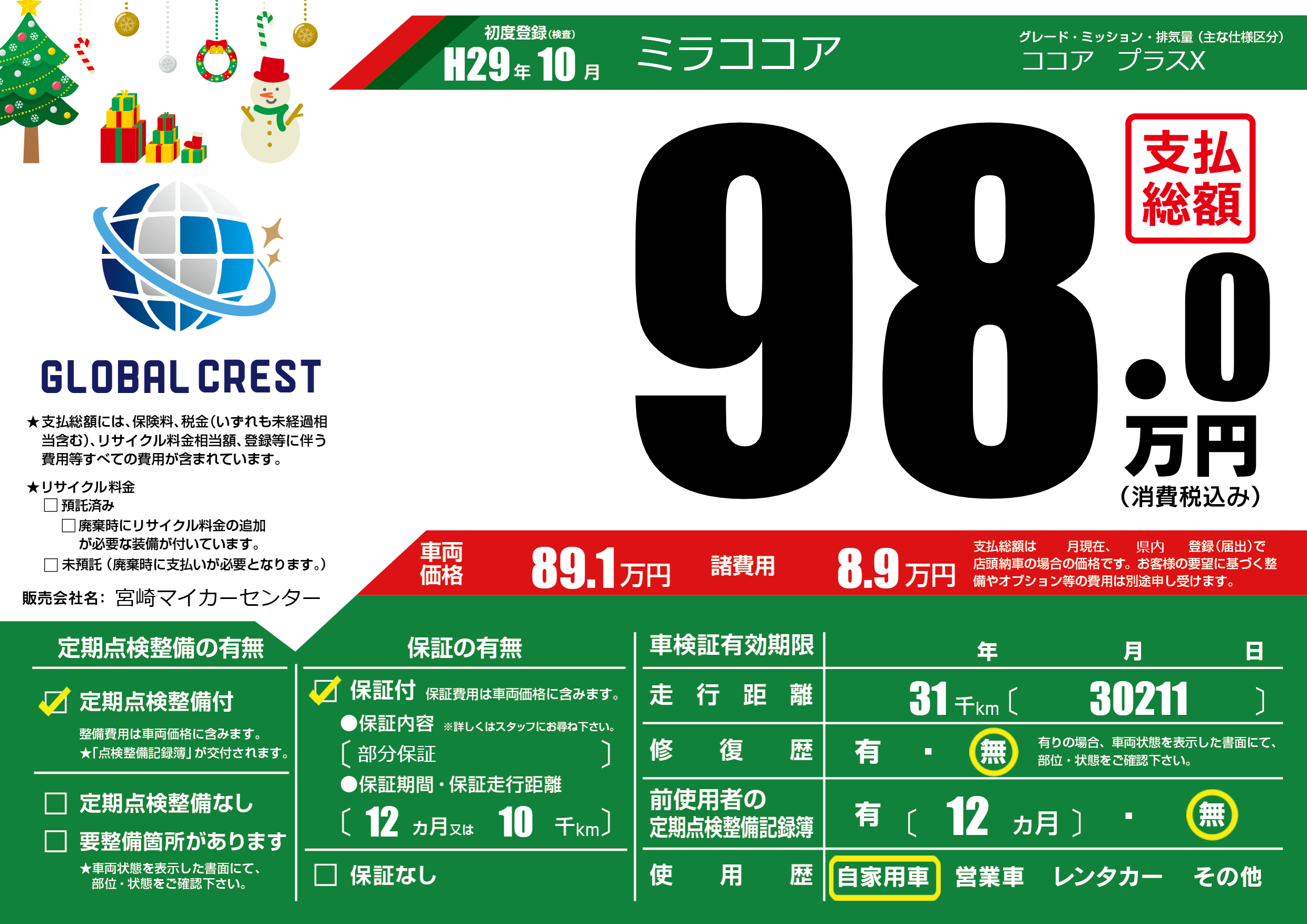 | 車名 | ミラココア | グレード ミッション 排気量 |