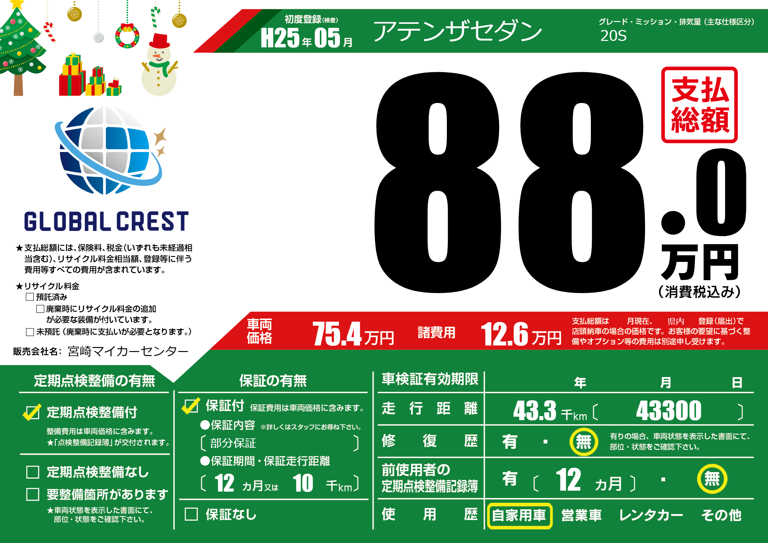 | 車名 | アテンザセダン | グレード ミッション 排気量 |
