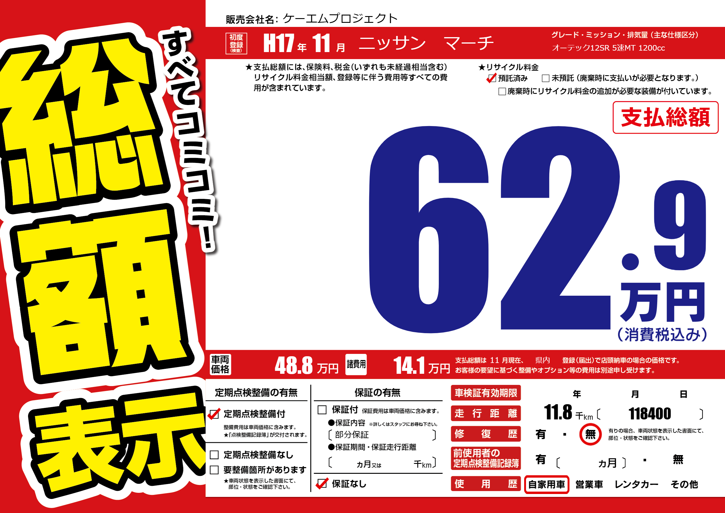 | 車名 | ニッサン マーチ | グレード ミッション 排気量 |